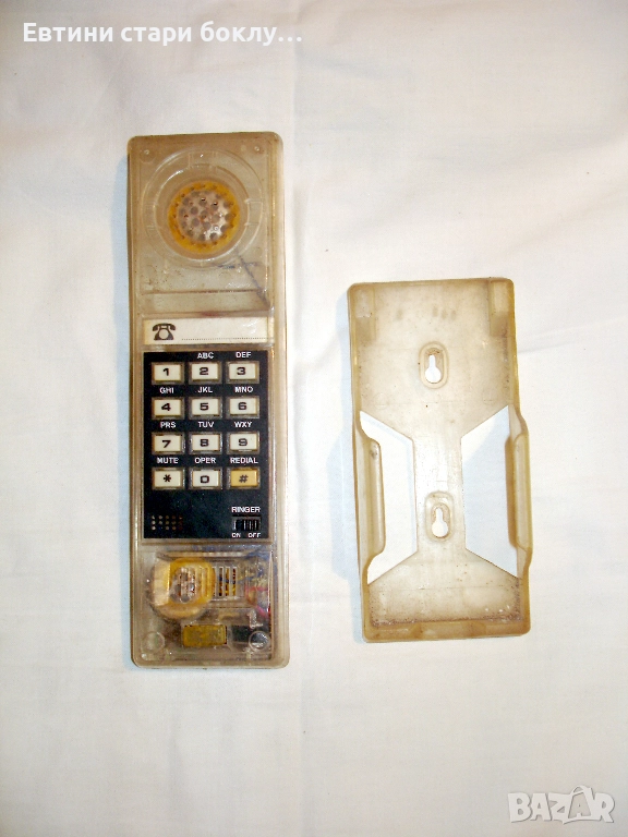 Предлагам ретро телефон, много рядък модел. Изработен е от прозрачна пластмаса. В комплект със стойка за закрепване на стена.