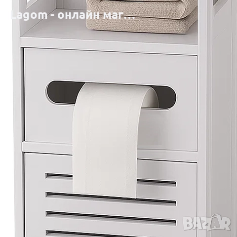 - държач за тоалетна хартия – дискретна, практична кутия с отвор, която улеснява бързото и хигиенично изваждане на хартията, без да се отваря цялата шкафче