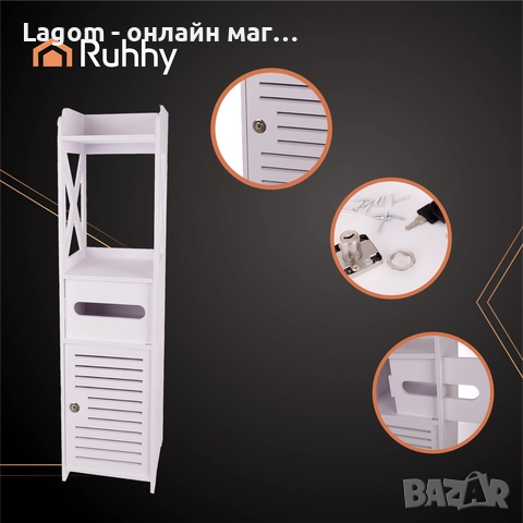 Свободностоящ шкаф за баня с държач за тоалетна хартия, заключващ се, колонен рафт в бяло RUHHY! 25763