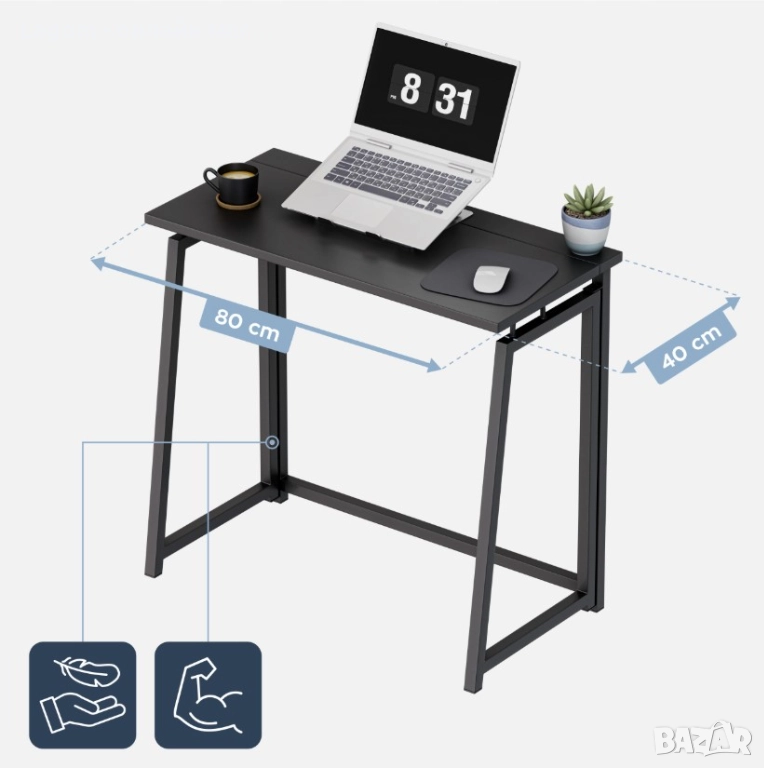- сгъваем дизайн – идеално решение за малки пространства и апартаменти, бюрото може да се сгъне за секунди, когато не се използва