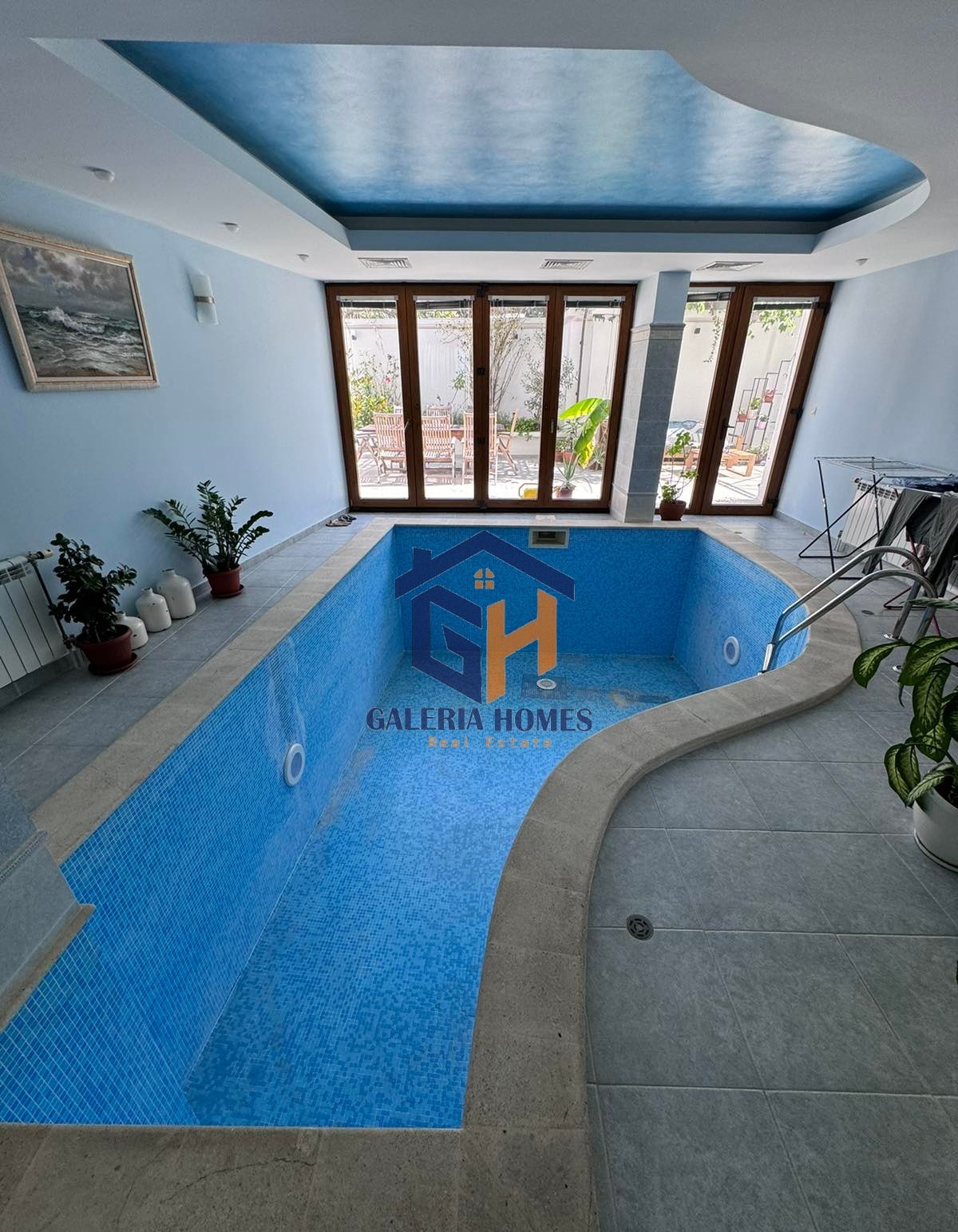Етаж 1: просторна дневна с камина, зимна градина с излаз към голяма тераса - веранда с Панорамна Гледка към Морето и града, вътрешен басейн, сауна, санитарни помещения и външен южен двор с лятна кухня.