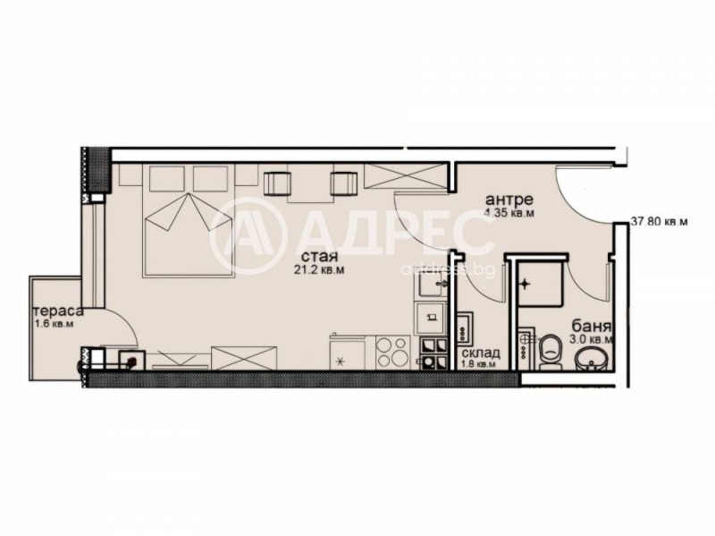 Едностаен апартамент с 37,80 кв.м. застроена площ, състоящ се от: входно антре, всекидневна, баня, склад и тераса. Северозападно изложение.