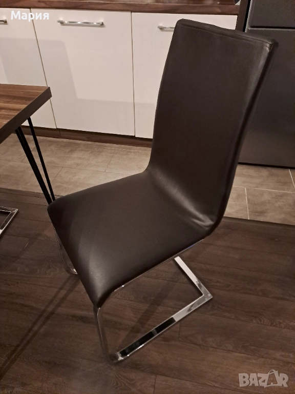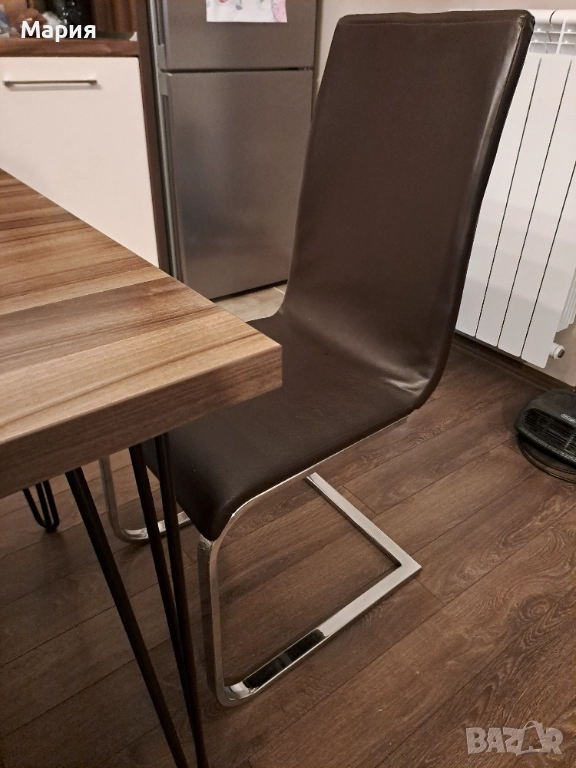 Комплект кухненски столове 6бр. + допълнително калъфи за тях. Столовете са метални, а седалката е тапицирана с кафява изкуствена кожа, имат и допълнително платнени бежови калъфи. Много са запазени без скъсано и протрито. Комлекта е 360 лв. Взимане от място.