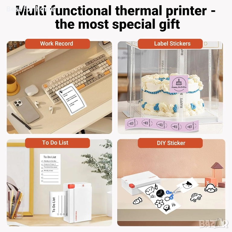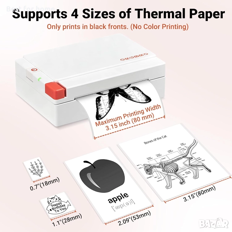 Широко приложение: Мини принтерът за стикери е идеален за печат на учебни бележки, флаш карти по анатомия, графични диаграми за математика, химия, география и физика, както и за ефикасно организиране на откъси; Подходящ е и за дома, офиса, проекти „Направи си сам“ и търговска употреба.