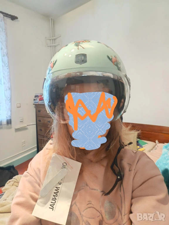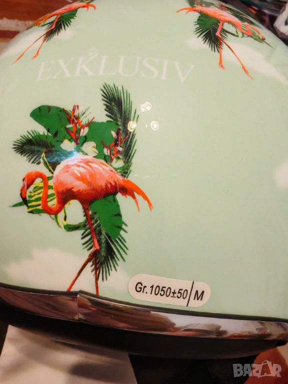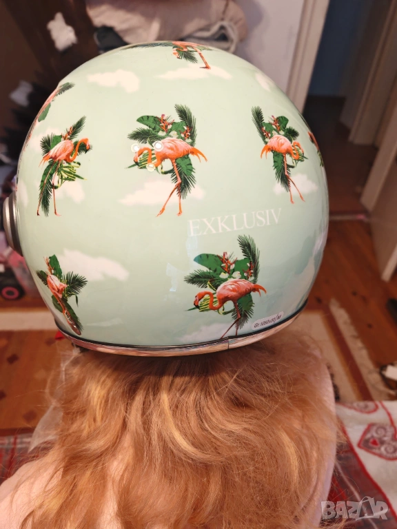Нова, с етикет каска за скутер, марка Exklusiv, дизайн - фламинго. За детайли, моля, пишете на лично съобщение. Размер М.