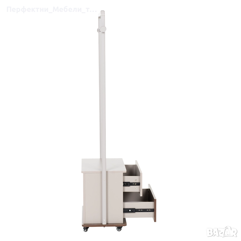 Разполага с 1 метален лост за закачалки, 2 чекмеджета за съхранение на дребни вещи и удобна мобилност благодарение на вградените колелца. Перфектно допълнение за антре, спалня или гардеробна
