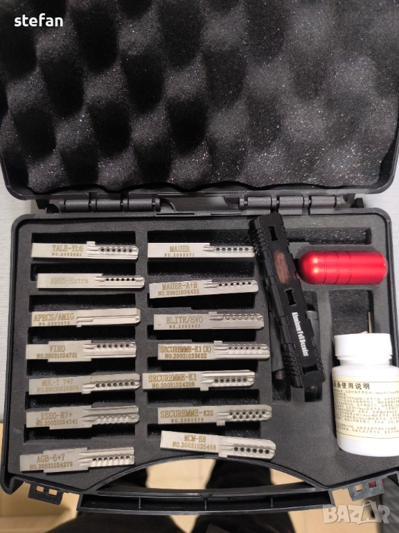 който работи на сто процента . комплекта се състои от 14 части. обхваща 90 процента от патронниците на българският пазар. оборудван е с фолиа които са подготвени за работа