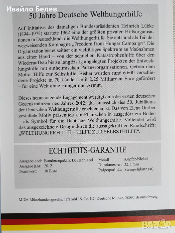 1) Възпоменателната монета от 10 евро, отбелязваща 50 години от германската организация за борба с глада в света (2012 г., медно-никелова).