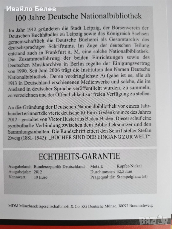 2) Възпоменателната монета от 10 евро, отбелязваща 100 години от националната библиотека на Германия (2012 г., медно-никелова).