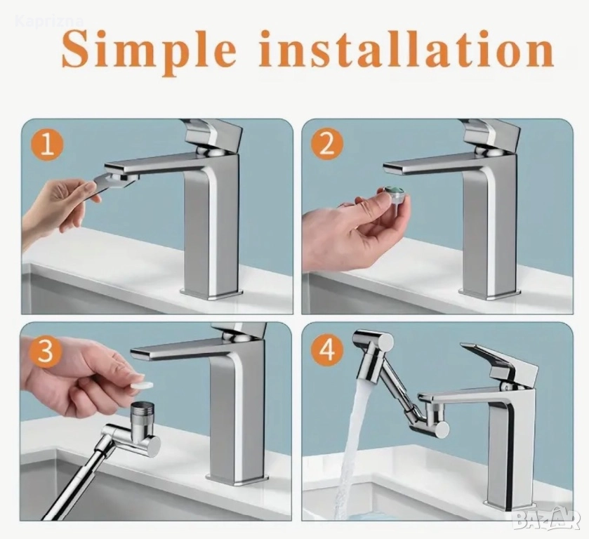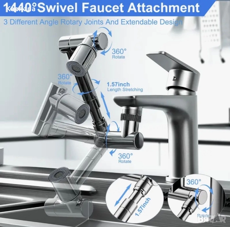 Удължител за смесител е приставка към смесителя, предназначена да разпръсква водния поток. Това е една евтина, но много полезна джаджа за дома, която бързо ще се изплати със сигурност повече от достатъчно. Благодарение на въртящите се на 360° глави ви позволява да насочвате водата точно там, където ви е необходима, без да мокрите ръцете си. Чрез своята гъвкава възможност за въртене на 1080°, удължителят позволява достъп до всички ъгли на мивката.