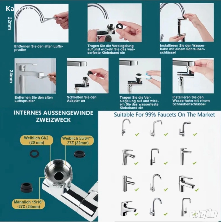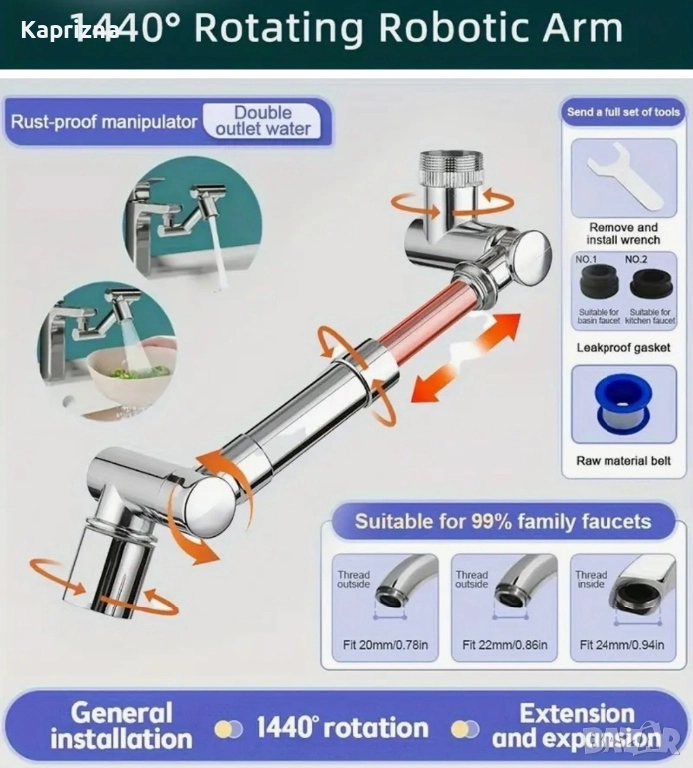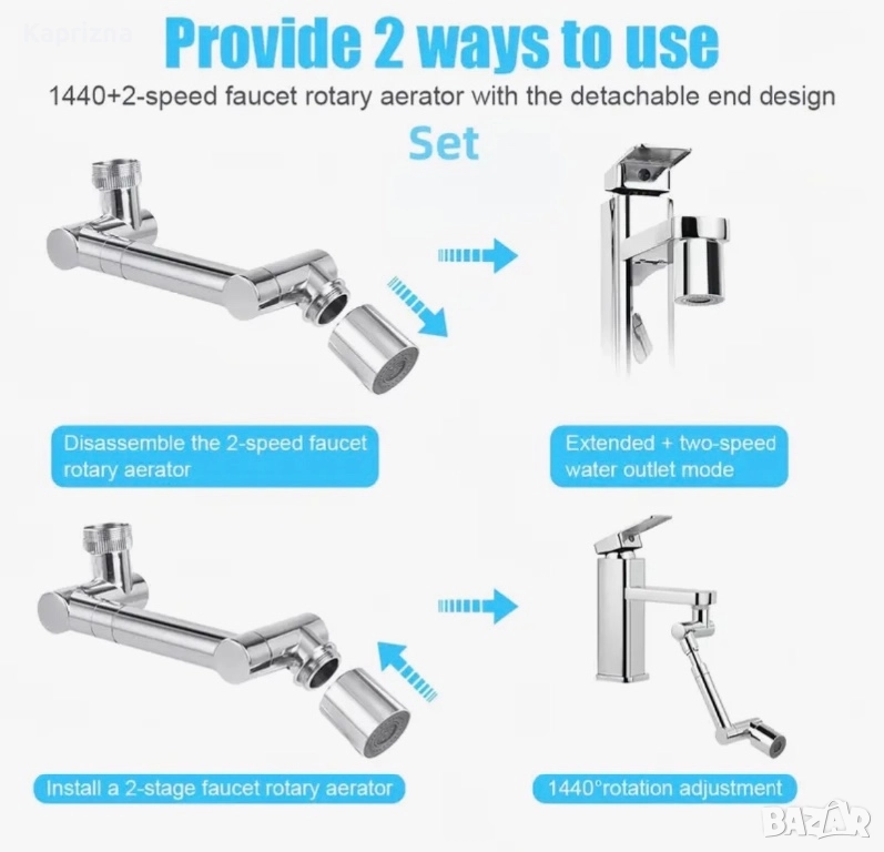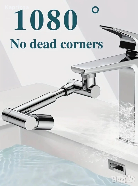 Отсега нататък миенето и изплакването на зъбите, наливането на вода в купа или кофа няма да е проблем! Универсалният удължител за въртящ се кран ще ви улесни да използвате умивалника си по много начини всеки ден. Благодарение на удължителния накрайник, който се огъва на две места под различен ъгъл, е възможно да регулирате водната струя във всяка посока. Накрайникът е снабден с аератор, което означава, че се използва по-малко вода и чешмата е по-удобна за използване.