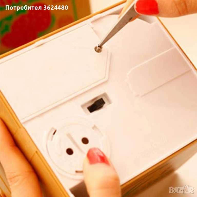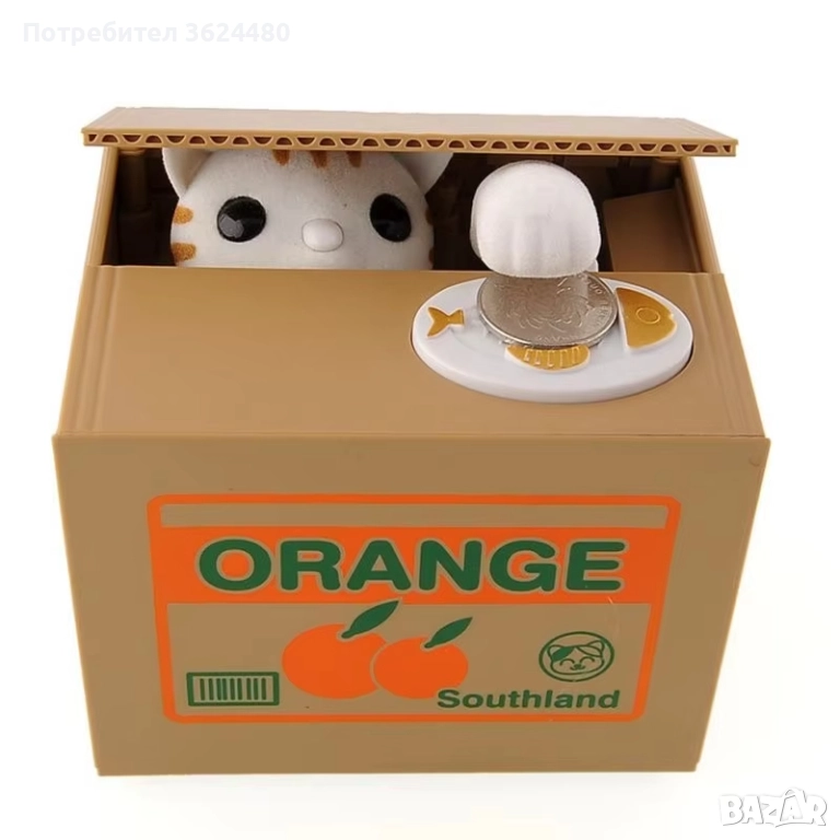 Касичката изглежда като кашон, в който е скрито малко мече панда. Поставете монетка върху специалното бутонче, и вижте как пандата отваря капака и с лапичка прибира монетата вътре – напълно безопасно и много забавно!