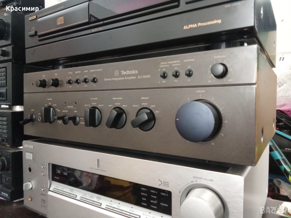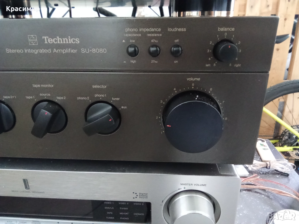 Technics SU-8080 е интегриран стерео усилвател с...72 вата на канал при 8Ω, общо хармонично изкривяване от 0,02% и коефициент на затихване от 70 .Основните характеристики включват множество входове (Phono 1, Phono 2, тунер, Aux, касета), отделни терминали Pre Out/Main In и контроли на тона. Тежи 13,5 кг и е с размери... Ширина-450мм, височина-140мм, дължина-371мм. Мощност и производителност Изходна мощност: 72 вата на канал на 8Ω (стерео)Изходна мощност: 90 вата на канал на 4Ω (стерео)Общо хармонично изкривяване: 0,02%Коефициент на затихване: 70 (8Ω), 35 (4Ω)Честотна характеристика: \(20-20,000\text{\ Hz}\)(\(+0/-0.1\text{\ dB}\))Ширина на честотната лента на мощността: \(5-40,000hz. Входове и изходи Входове: Phono 1, Phono 2, Тунер, Aux, Касета 1 (Запис/Възпроизвеждане), Касета 2 (Запис/Възпроизвеждане)Изходи: Pre Out, Main In, Line Out, Speaker Out