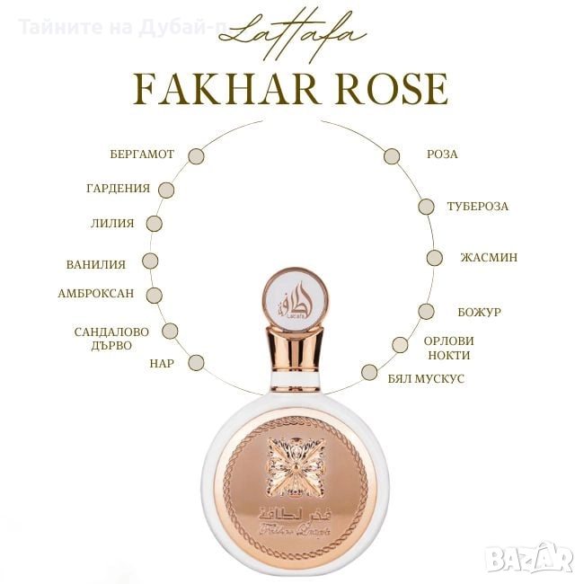 Fakhar Rose от Lattafa Perfumes е флорален аромат за жени, лансиран през 2022 г. и вдъхновен от L’Interdit на GIVENCHY. Той отразява духа на свободата и автентичността, като придава вълнуваща нотка на вашата ежедневна рутина. Изисканият аромат не само ви пленява със своята сензуалност, но и ви предизвиква да изразите своята индивидуалност, независимо от общоприетите норми. С Lattafa Fakhar Rose сте приготвени да разкриете своята уникална същност и да събудите в себе си дързостта да бъдете различни.