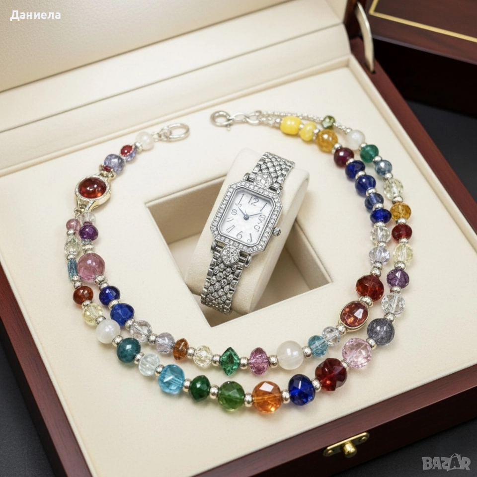 Материали: метален корпус, декоративни кристални елементи, акрилни и стъклени мъниста, плътна гривна с метални елементи; Размери: стандартна дължина на гривната с регулиране; компактен корпус, удобен за ежедневие; Цветове: многоцветна двойна гривна; сребрист корпус с камъни; Безопасност: хипоалергенни материали, подходящи за чувствителна кожа; Допълнителни елементи: регулируема закопчалка, стабилна конструкция; Опаковка: подходяща за директно подаряване.