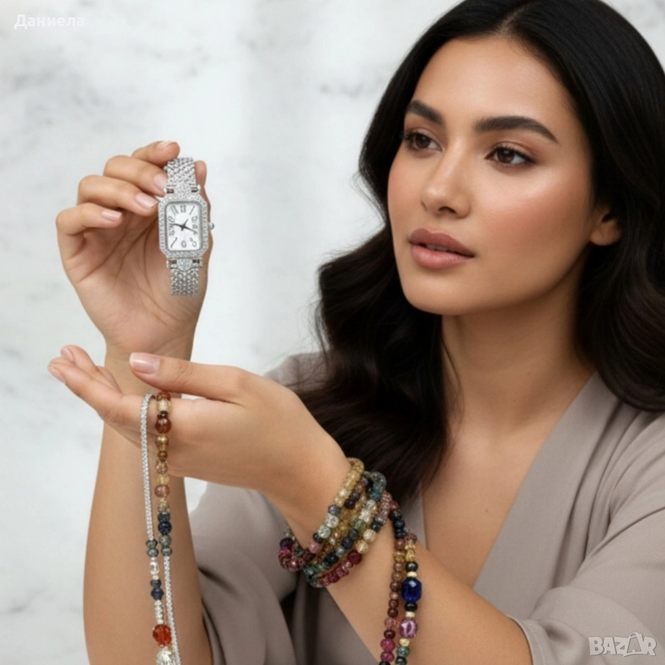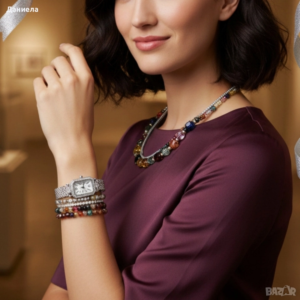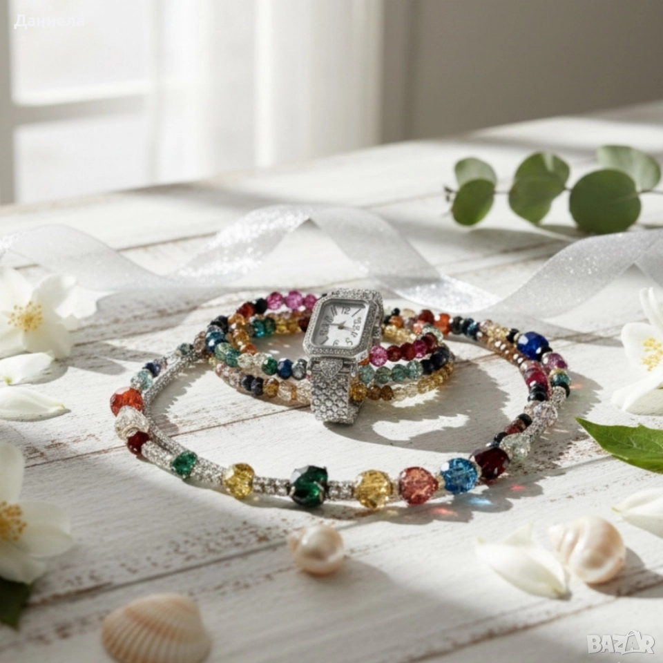 Материали: метален часовник, декоративни кристали, акрилни и стъклени мъниста, метални елементи; Елементи в комплекта: 1 часовник, 3 гривни, 1 колие; Размери: стандартна дължина на колието и гривните; компактен часовник; Цветове: многоцветни мъниста + сребрист корпус на часовника; Безопасност: хипоалергенни материали, нежни към кожата; Опаковка: подходяща за съхранение или подаряване.