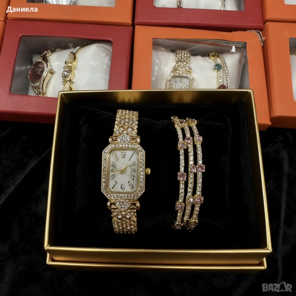 Луксозен дамски комплект: часовник и гривни в златист цвят