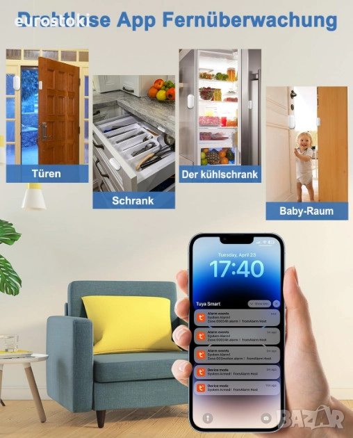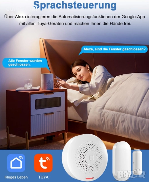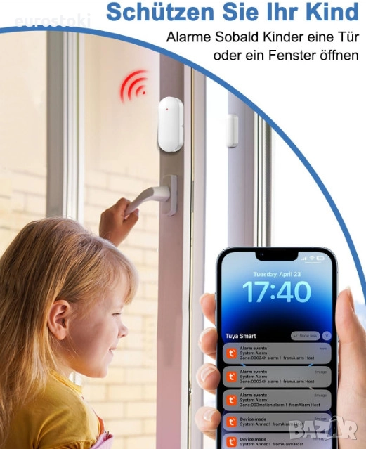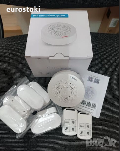 Интелигентна система за домашна сигурност. Когато важни входни зони, като прозорци/врати, се отворят или се засече движение, ще получавате незабавни push известия на телефона си и това ще задейства силна аларма от 120 децибела. Хъбът на главния контролер свързва всички сензори. Включени са 5 сензори за врати и прозорци + 2 дистанционни управления.