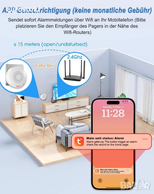 Управление чрез приложение Tuya и Smart Life. С тази WiFi алармена система със сензори за врати и прозорци можете да активирате и деактивирате системата чрез интелигентен софтуер за дома, да получавате известия, да задавате режими на аларма, да синхронизирате и наблюдавате всички алармени устройства. Моля, проверете дали сте свързани към 2.4GHz WiFi канал.