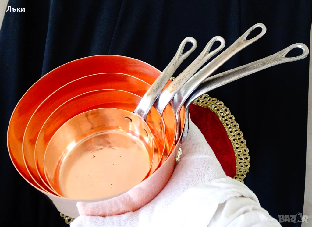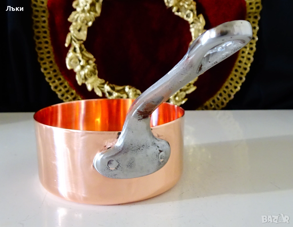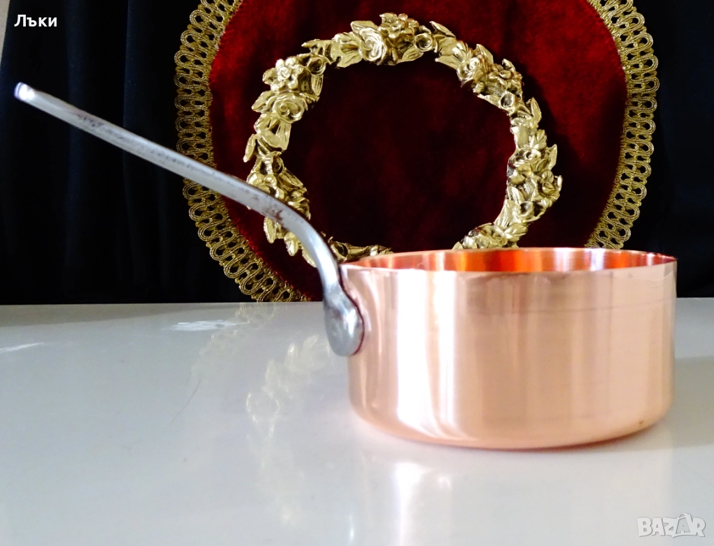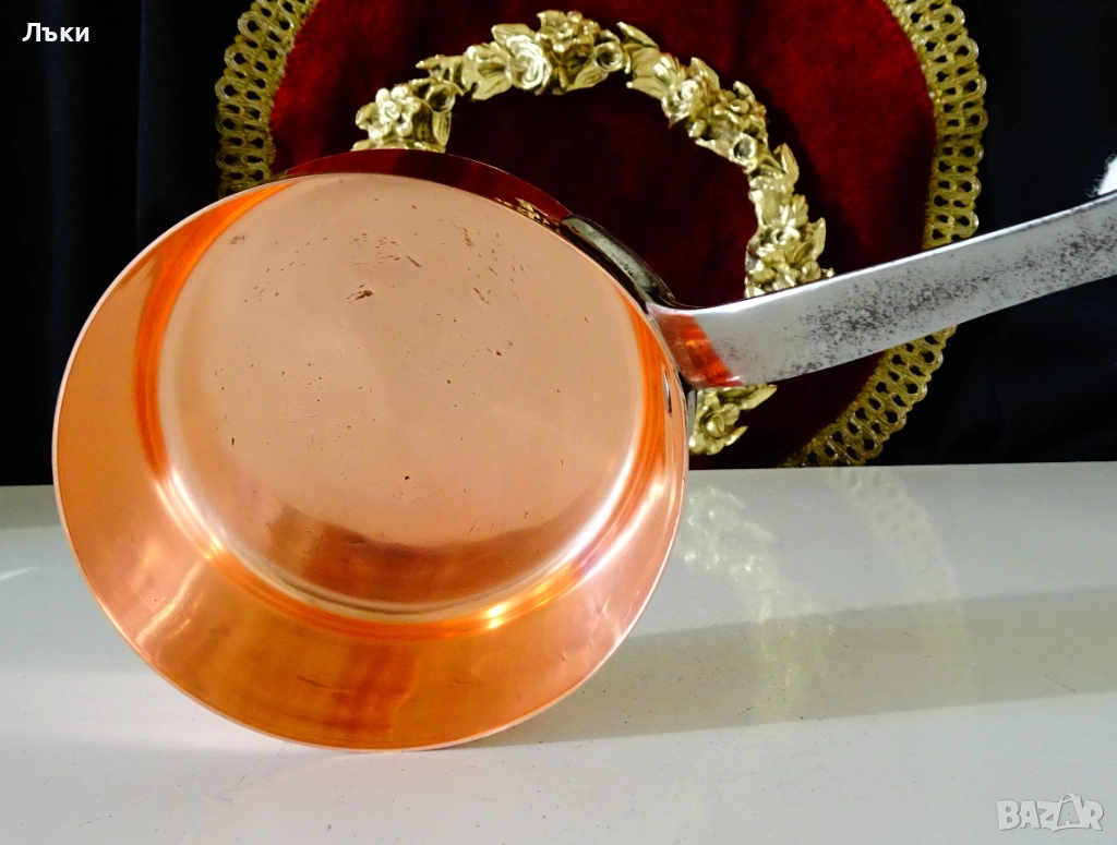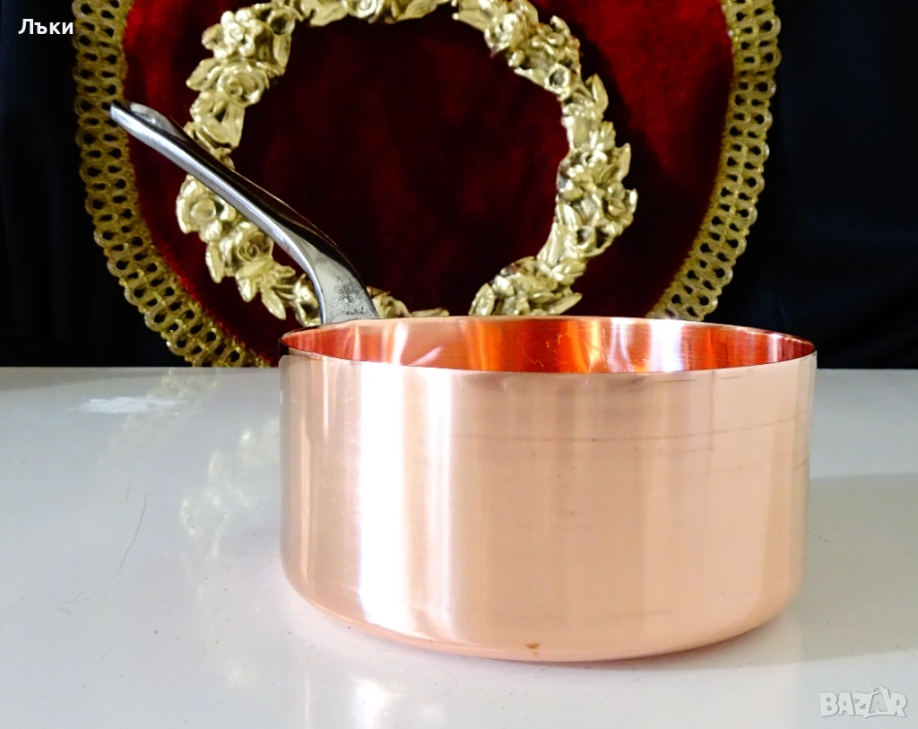 Стара медна тенджера,касерола,тиган за сосове,карамел,майсторска ръчна изработка от масивна чиста червена мед.Има яка чугунена дръжка закрепена с медни нитове.От вътре не е калайдисана,подходяща за медна вода.Тенжерата не е ползвана,блести ослепително