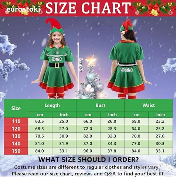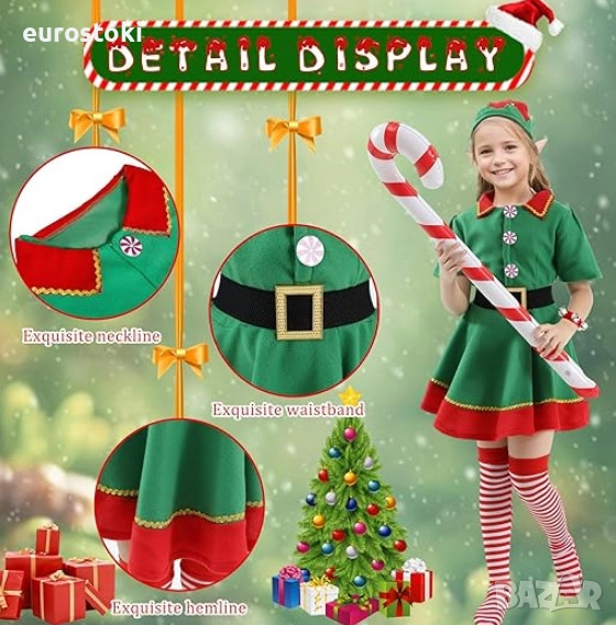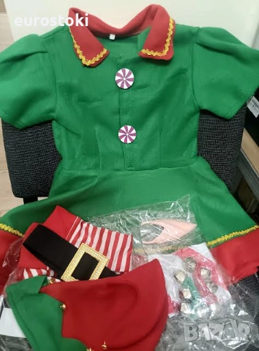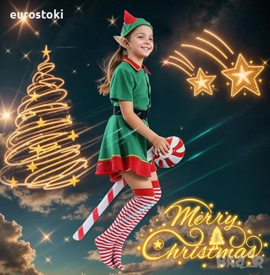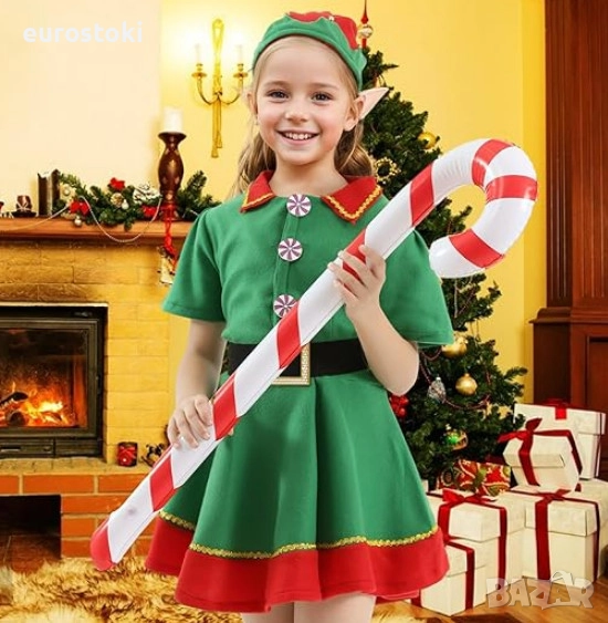 Детският коледен костюм на Елф включва 7 части – коледна рокля на Елф, шапка, колан, дълги чорапи, чифт елфски уши, чифт гривни с камбанки, надуваема коледна близалка.