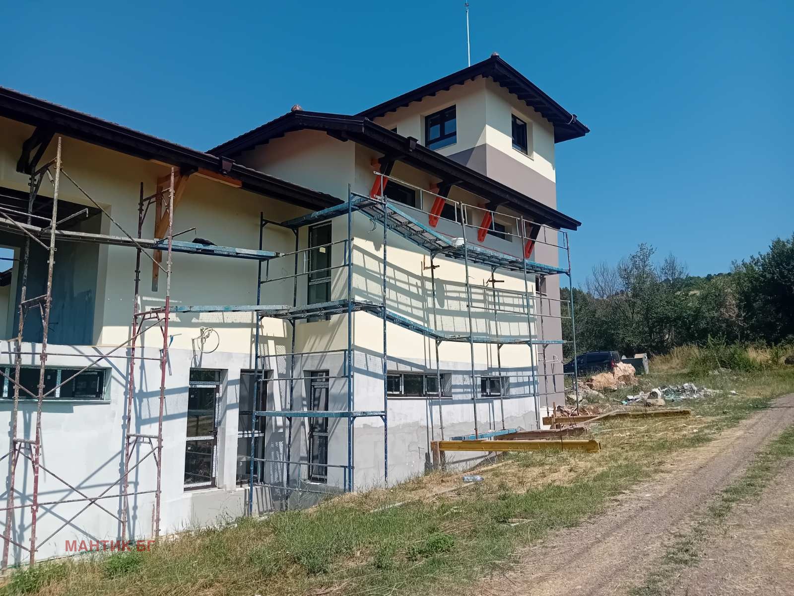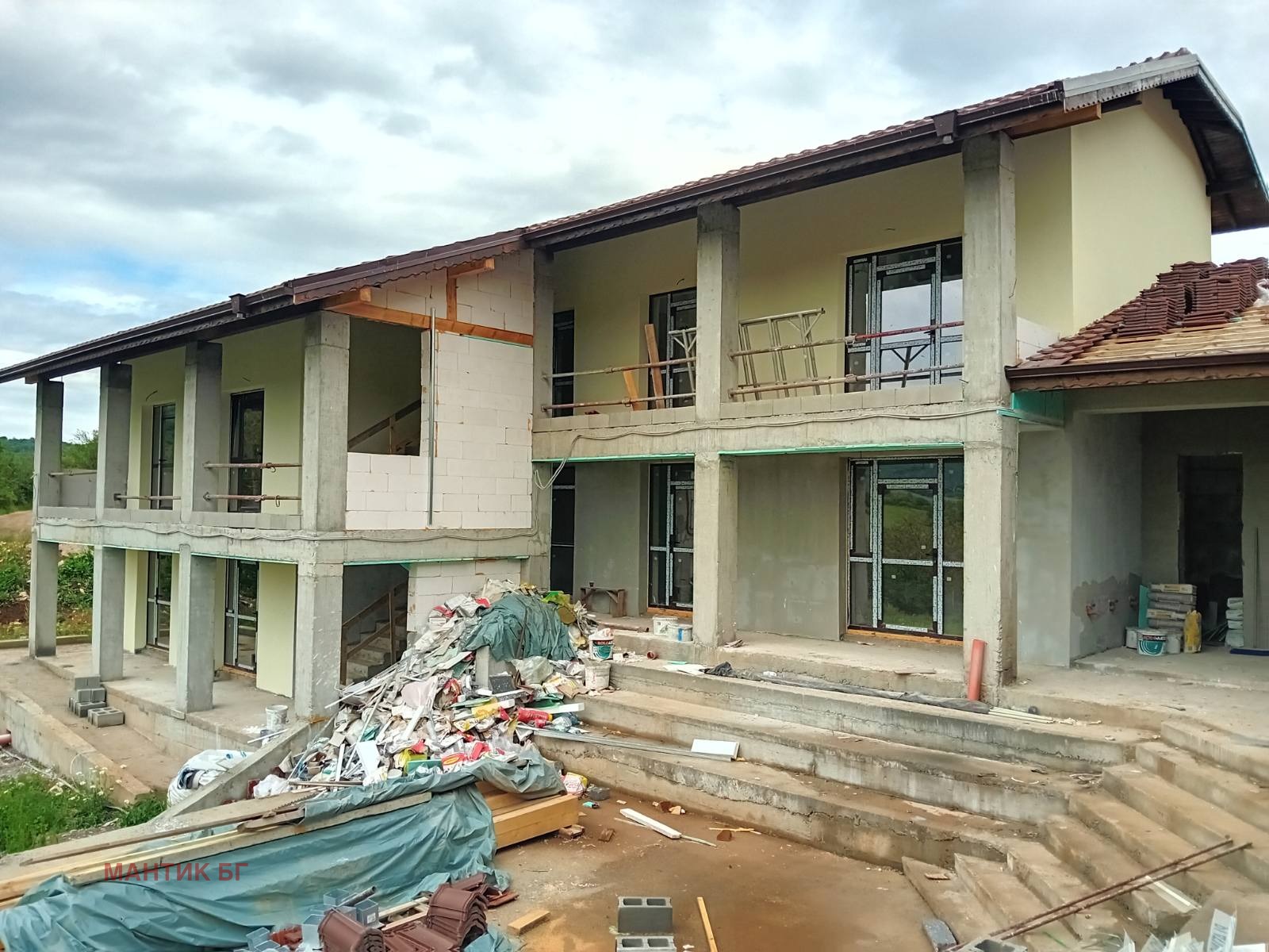 Етап на завършеност: Сградата е изградена напълно на груб строеж с оставащ кофраж от EPS с допълнителна изолация 10 см - графит. Монтирана е алуминиева дограма с термомост. Изградени са трасетата за ЕЛ и ВИК.Изолацията с мазилката са частично довършени.