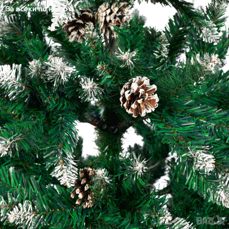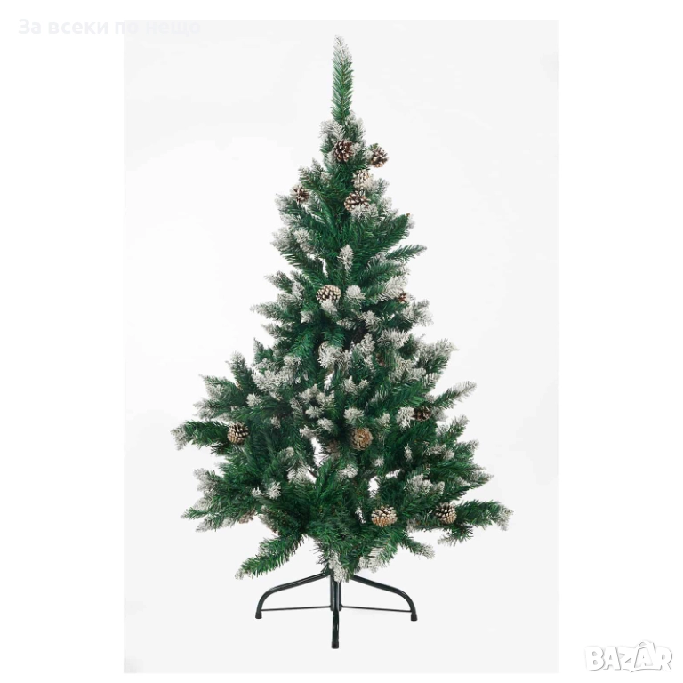 Елхата е декорирана с 34 естествени на вид шишарки и фини побелели връхчета, които носят усещане за зимна приказка. Стабилната метална стойка осигурява надеждна опора и лесен монтаж.