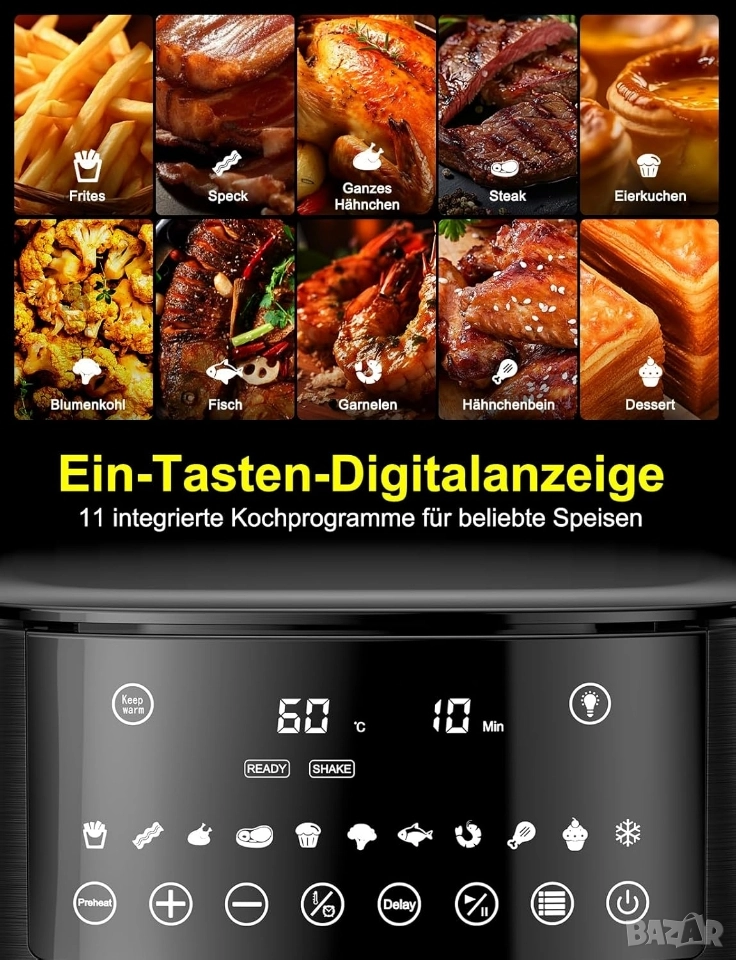 * 11 Предварително зададени програми: Автоматизирани режими за популярни ястия, включително: пържени картофи, бекон, цяло пиле, пържоли (стек), сладкиши (egg tarts), карфиол, риба, скариди, пилешки бутчета, десерти и замразени храни.