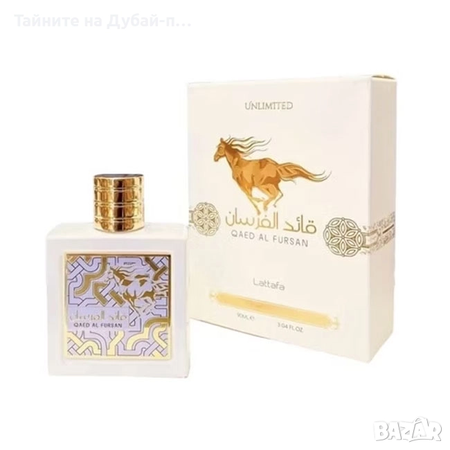 Qaed al Fursan Unlimited Lattafa унисекс парфюм с ориенталски подправки за свободни и елегантни хора. Отваря се с плодови нотки, флоралните нотки представляват сърцето, а основата е съставена от дървесни и сладки нотки.