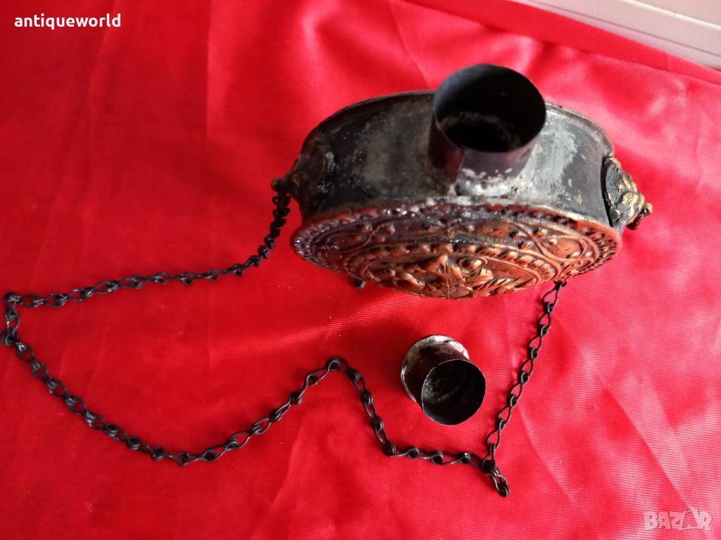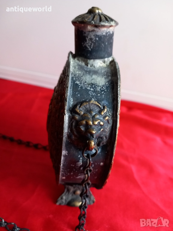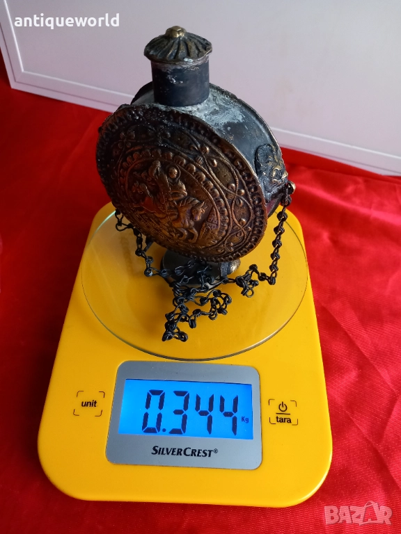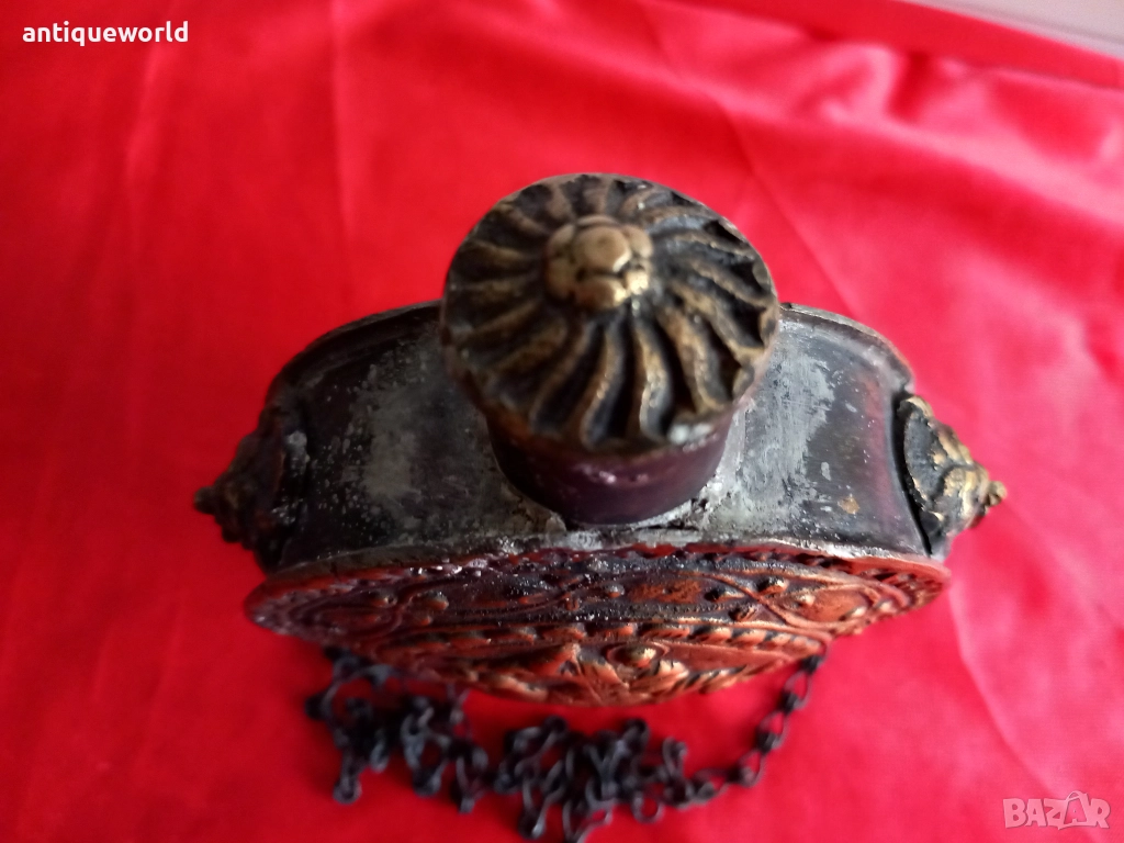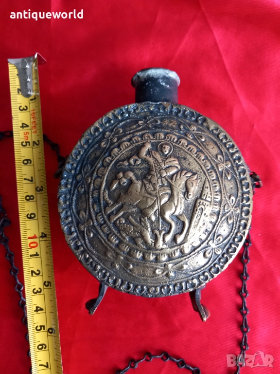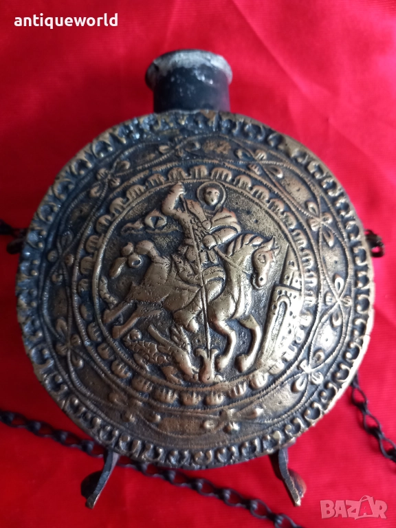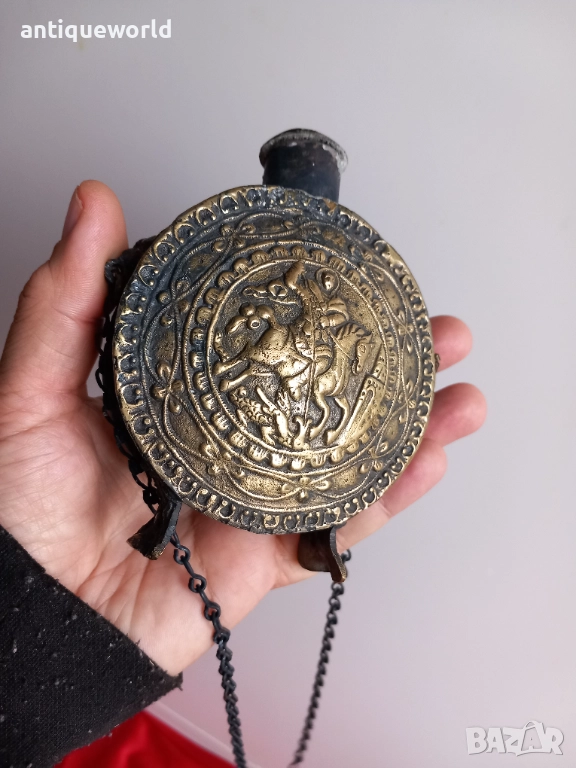 19Век. Много Красива Стара Възрожденска Масивна Бронзова Барутница,Барутник с Изображението на Свети Георги Победоносец Убиващ Змея.
