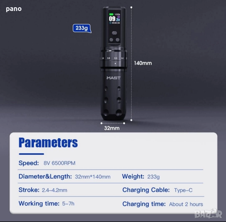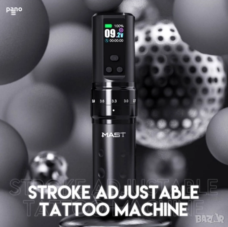 (Нова, фабрично запечатана200€ с две батерии Mast Fold Pro 2.чисто нова, фабрично запечатана. Нов модел, с мощна батерия 2000мАч. Която издържа до 7 часа работа. Време за презареждане- 2часа. 7 регулиращи се строука(от 2.4,до 4.2), за изработване на всеки стил от микроблейдинг, СМП, и татуиране, във всички стилове. Цветен дисплей, изобразяващ-капацитет на батерия, времетраене, волтаж, опция джъмп страрт. Лесна за употреба с три бутона. Клик система при ръкохватката, и при регулирането на строук. Мощен coreless М1 мотор. Регулиране на волтажа от 4,до 12волта. Много тиха и без почти никакви вибрации.Тегло 233гр. Дължина 140мм. Диаметър 32мм.
