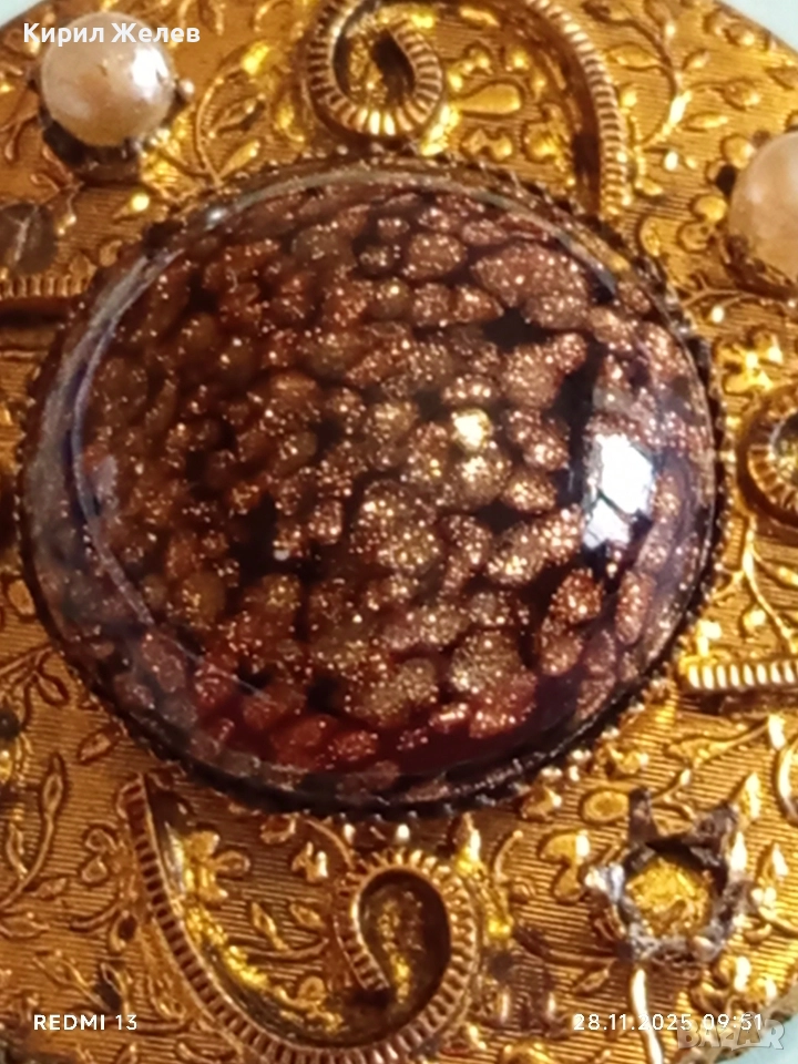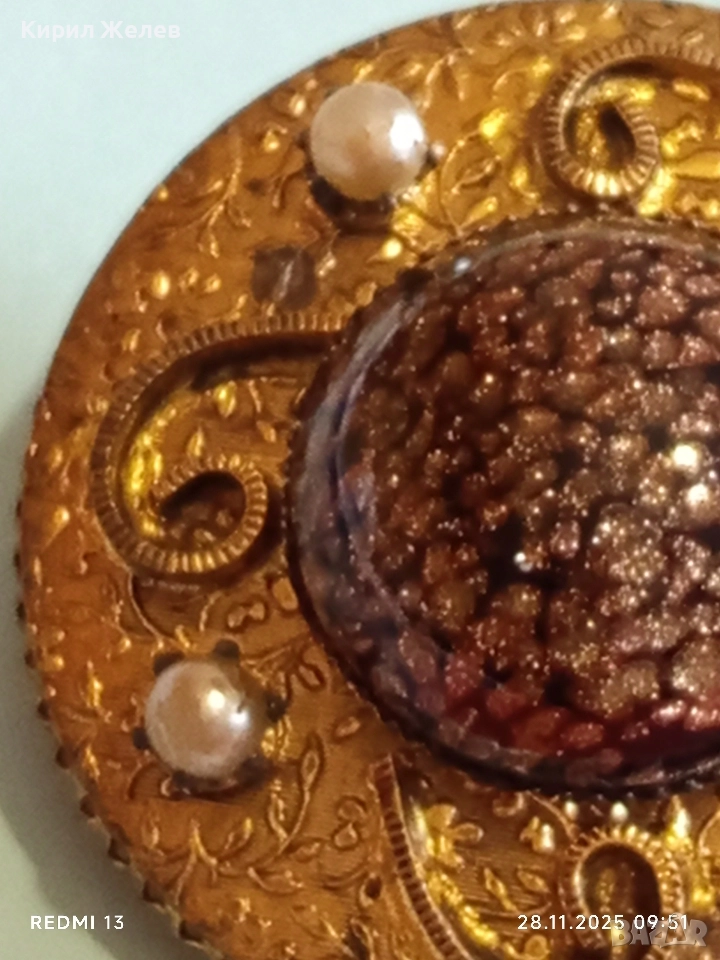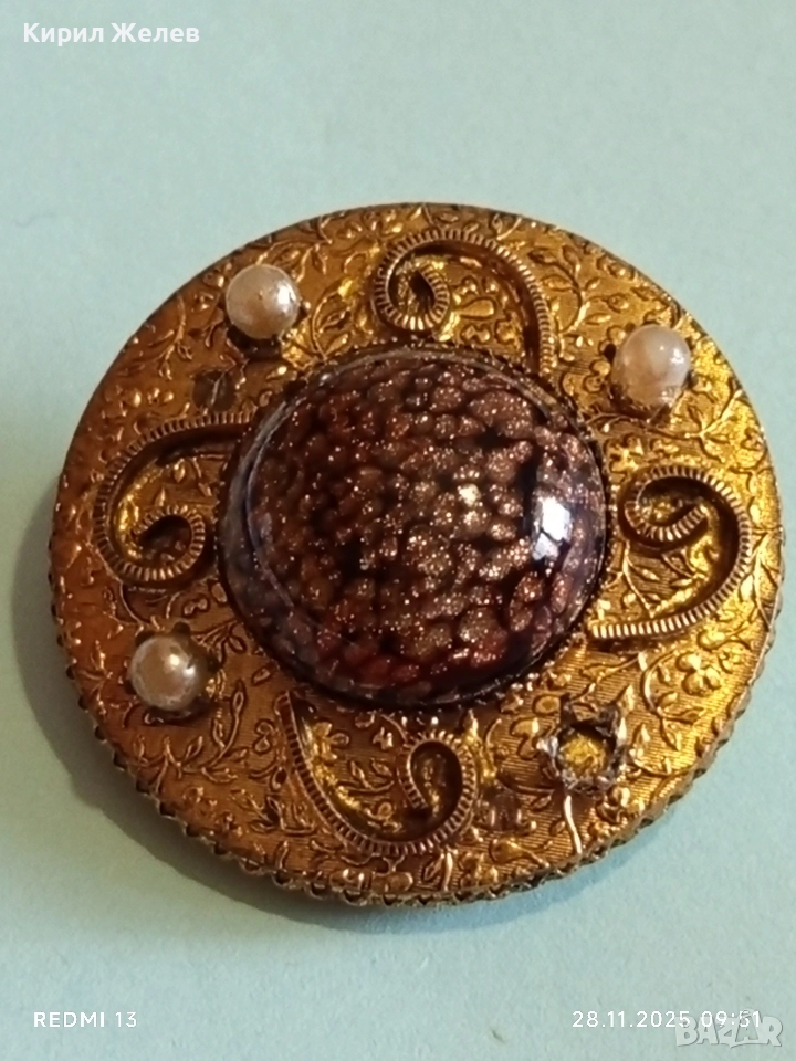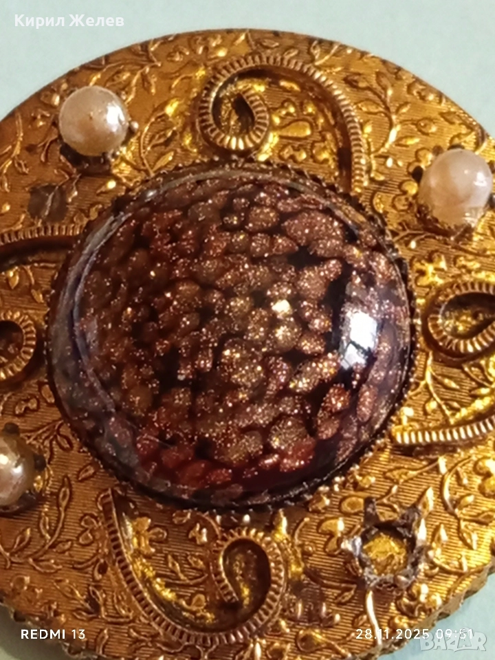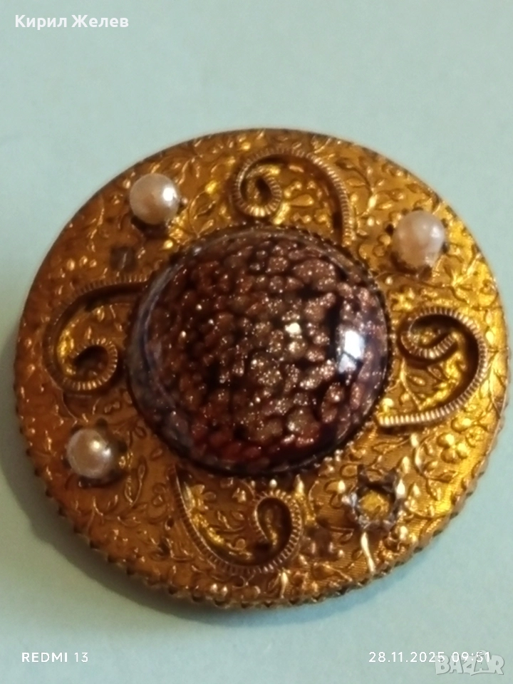 Винтидж брошка с централен СЛЪНЧЕВ камък АВАНТЮРИН и перлени акценти 26093