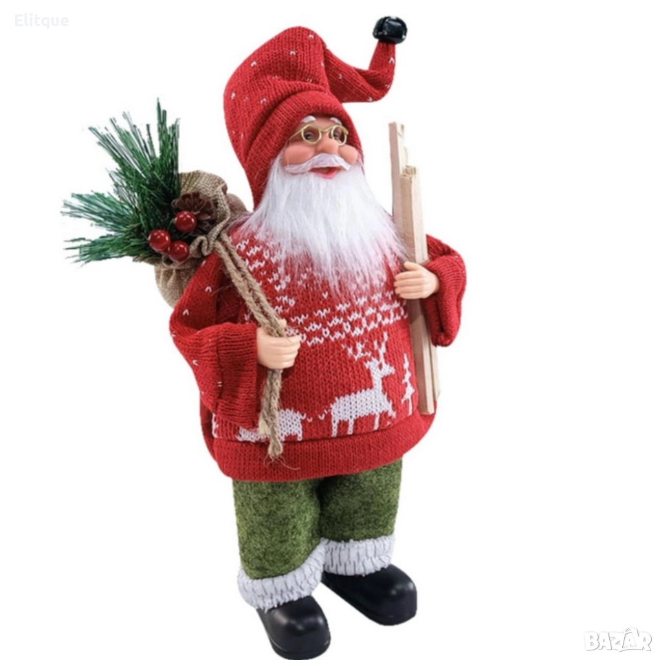 Технически характеристики Материали: пластмаса + текстил; Размери: дължина 17 cm, ширина 10 cm, височина 30 cm; Цвят: червен, зелен, бяло; Тегло: 200 g; Светлини: няма; Батерии: не са необходими; Допълнителни елементи: дървени ски, борова клонка, декоративни плодчета, плетена шапка и пуловер; Безопасност: подходяща за дом с деца; без остри ръбове; Подходяща за: елха, маса, камина, рафт, офис, коледен кът; Опаковка: защитна, подходяща за подарък.