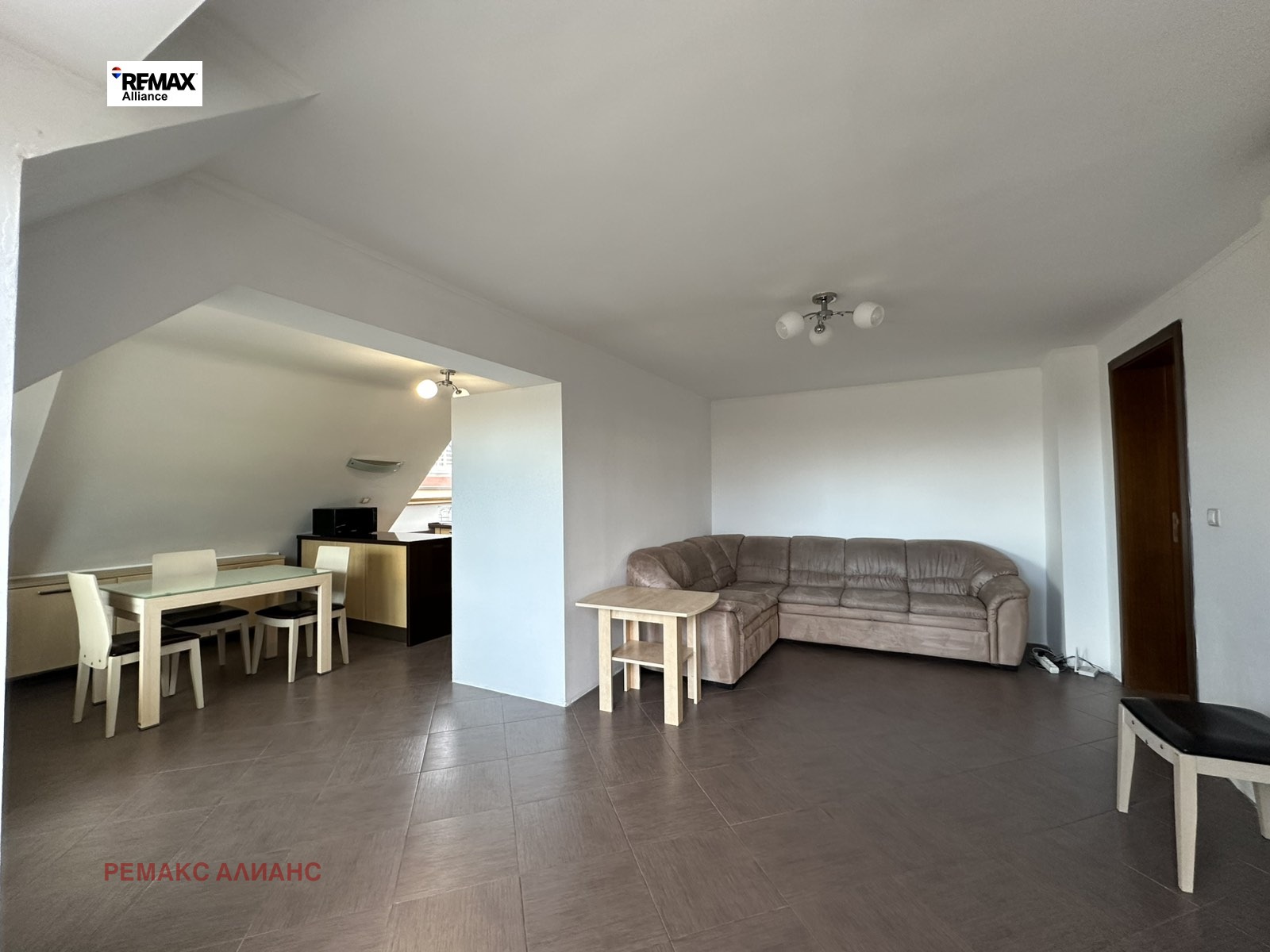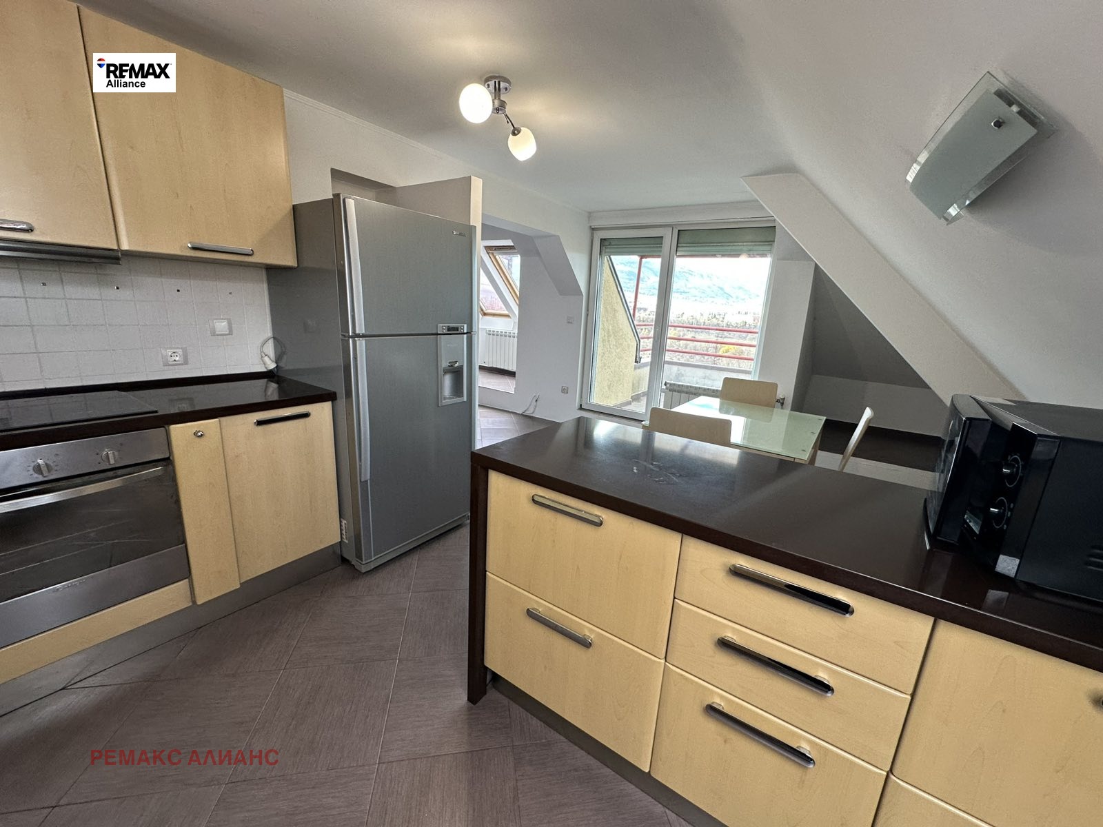 - Просторна дневна с напълно оборудван кухненски бокс, както и голяма открита тераса с панорамна гледка