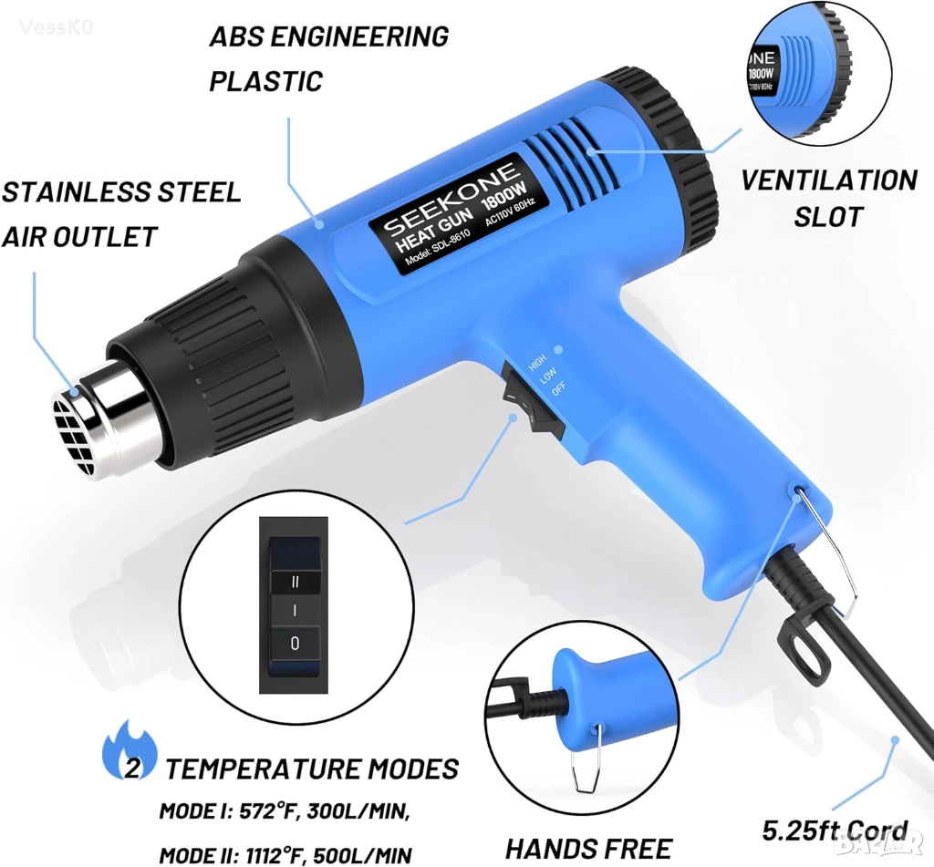 Променлива настройка на температурата за работа, подходяща за материала, и голямо разнообразие от приложения. Стационарното положение позволява използването на двете ръце за запояване или огъване. Заключващ се превключвател за непрекъсната употреба. Ергономичен дизайн на дръжката за удобна употреба дори за продължителни периоди от време. И двете ръце могат да бъдат свободни за запояване или огъване. Двускоростен термопистолет с променлива температура.