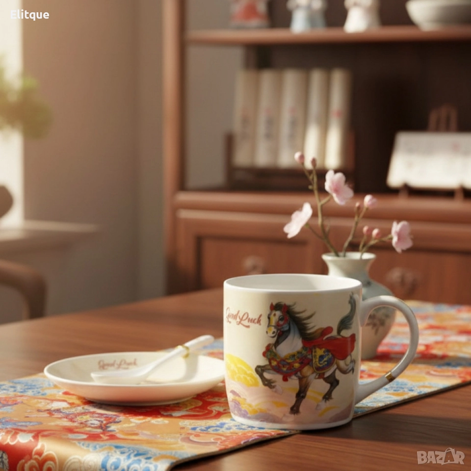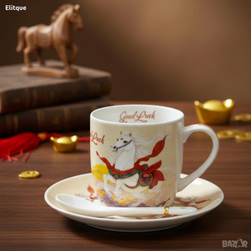 Подаръчен късметлийски порцеланов комплект – чаша, чинийка и лъжичка с празничен дизайн на коне