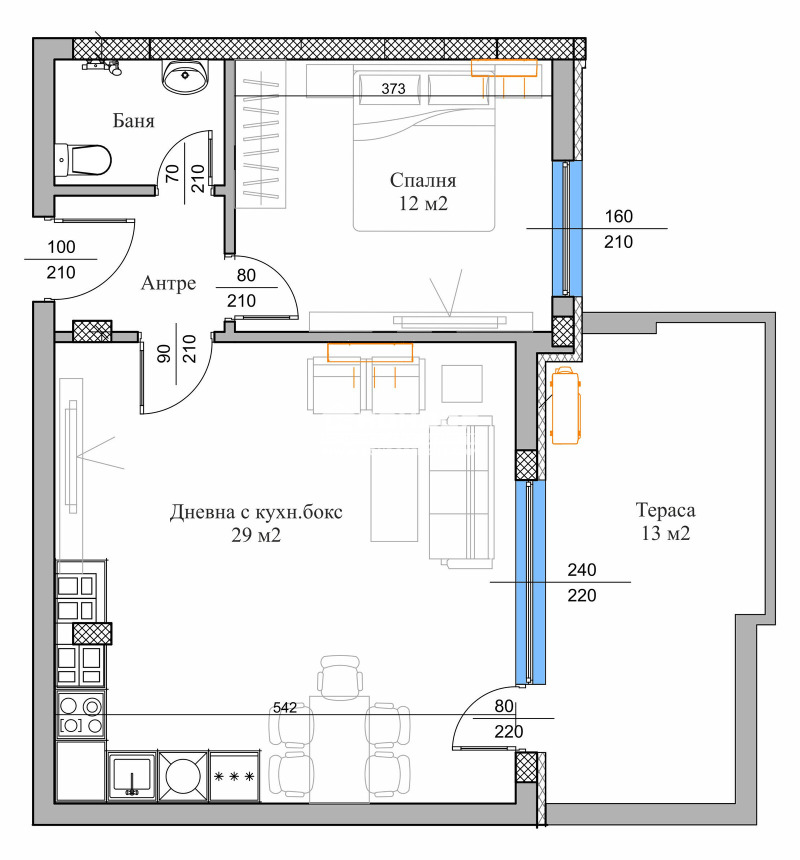 Предлагаме Ви двустаен апартамент с разпределение : просторна дневна - 29кв.м. с трапезария и кухненски бокс, самостоятелна спалня, баня с тоалетна и панорамна тераса !