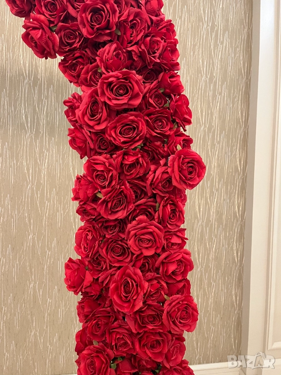 Стилна арка с изкуствени рози за сватба или друго парти. На арката са поставени около 500 рози. Розите имат и допълнителни зелени листчета, които са махнати, но са запазени, ако желаете да си ги добавите към украсата. Размер на металната арка 150 на 220 см.