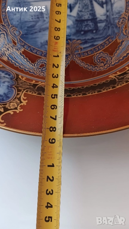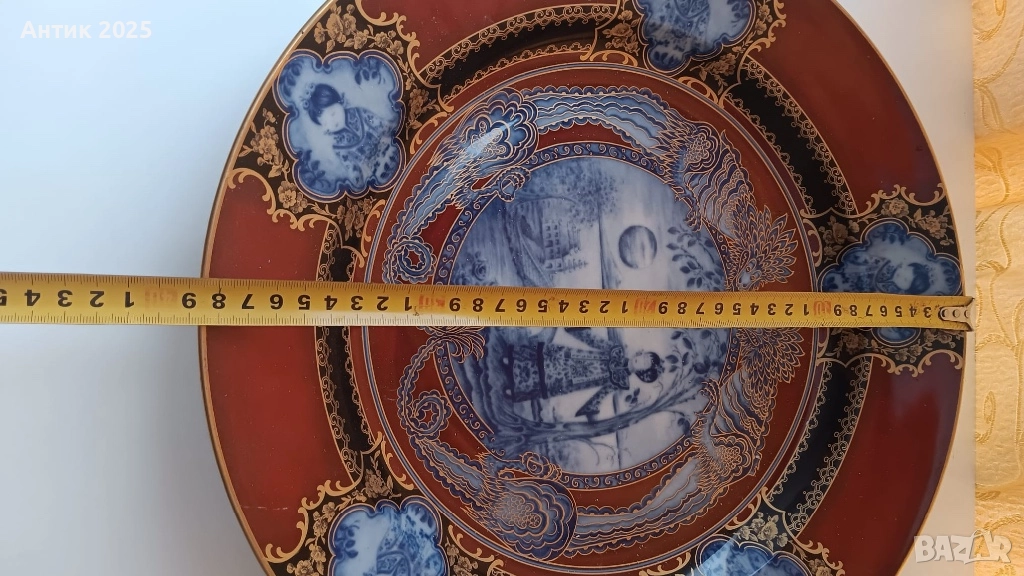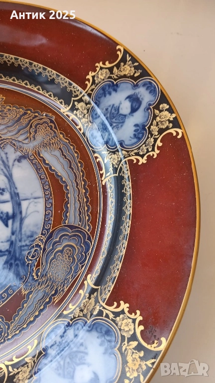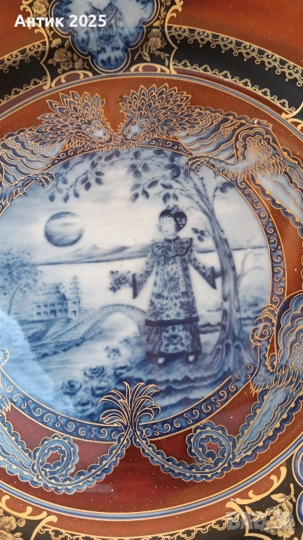 Тази изящна порцеланова чиния представлява колекцията «Siam» на производителя Kaiser Porzellan, известен още като AK Kaiser или Kaiser West Germany. Централната част е украсена с традиционен синьо-бял мотив, обграден от богата червеникаво-кафява и златиста рамка, която подчертава изискан дизайн. Чинията е изработена от висококачествен порцелан и е отличен елемент за колекция или декоративен акцент в интериора.