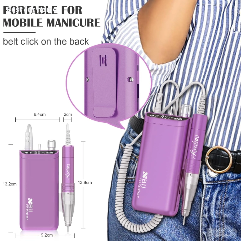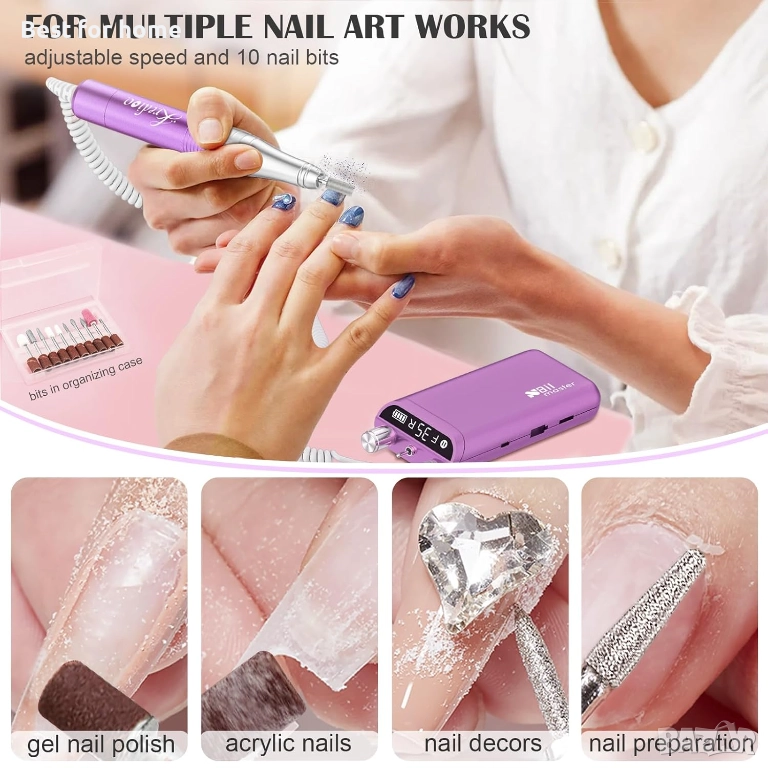 ПРОФЕСИОНАЛНА НОКТОПРОБИЛКА - Тази бормашина за нокти може да ви осигури професионално изживяване в салон за нокти у дома! Kredioo покани маникюристи да изпробват тази бормашина върху професионални акрилни нокти и резултатът се оказа перфектен. Тази бормашина за нокти може да се използва върху твърда повърхност, без често спиране, както другите електрически пили за дома.
