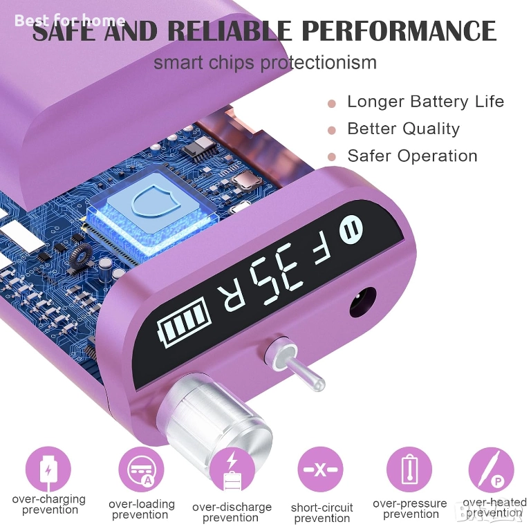 ПО-ДЪЛЪГ ЖИВОТ - Какъв е ключът към по-дългото време на употреба? Системата за самозащита е тази, която осигурява по-дълъг живот на батерията, по-добро качество и по-безопасна работа. Интелигентният чип в ядрото предпазва електрическата бормашина за нокти от прегряване, презареждане и свръхналягане.