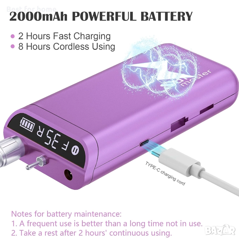 ГОЛЯМ КАПАЦИТЕТ НА БАТЕРИЯТА - Мощната батерия позволява на тази акумулаторна бормашина за нокти да работи 8 часа, което означава, че можете да правите маникюр на 60 клиенти без често зареждане! Пълното зареждане отнема само 2 часа. Моля, обърнете внимание, че за по-дълъг живот на батерията, честата употреба е по-добра от дълго време без употреба.