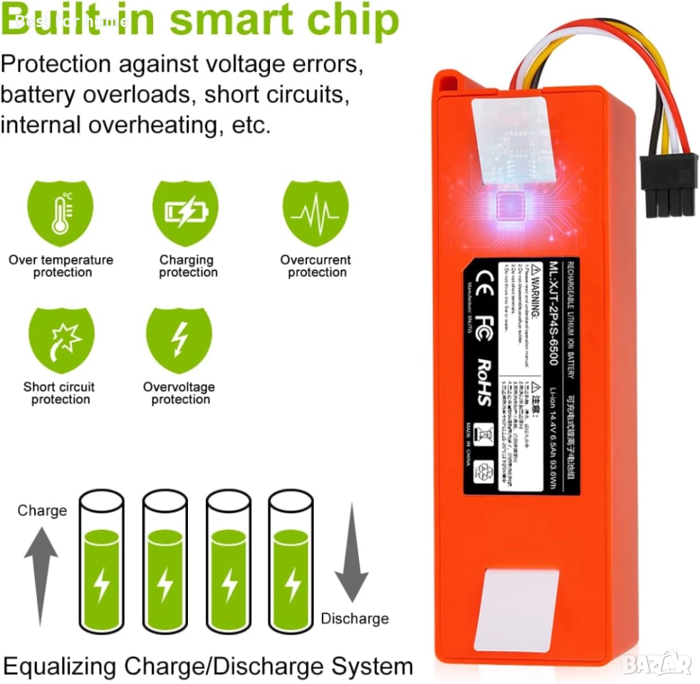 Батерия с висок капацитет: тип: литиево-йонна. Напрежение: 14.4 V. Капацитет: 6500 mAh. Мощност: 93.6 вата. Осигурява стабилно захранване за Xiaomi Mijia Roborock.