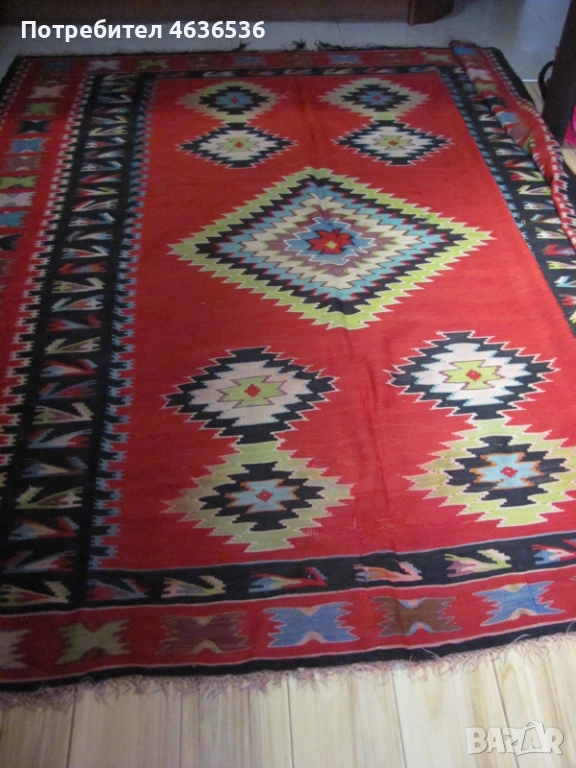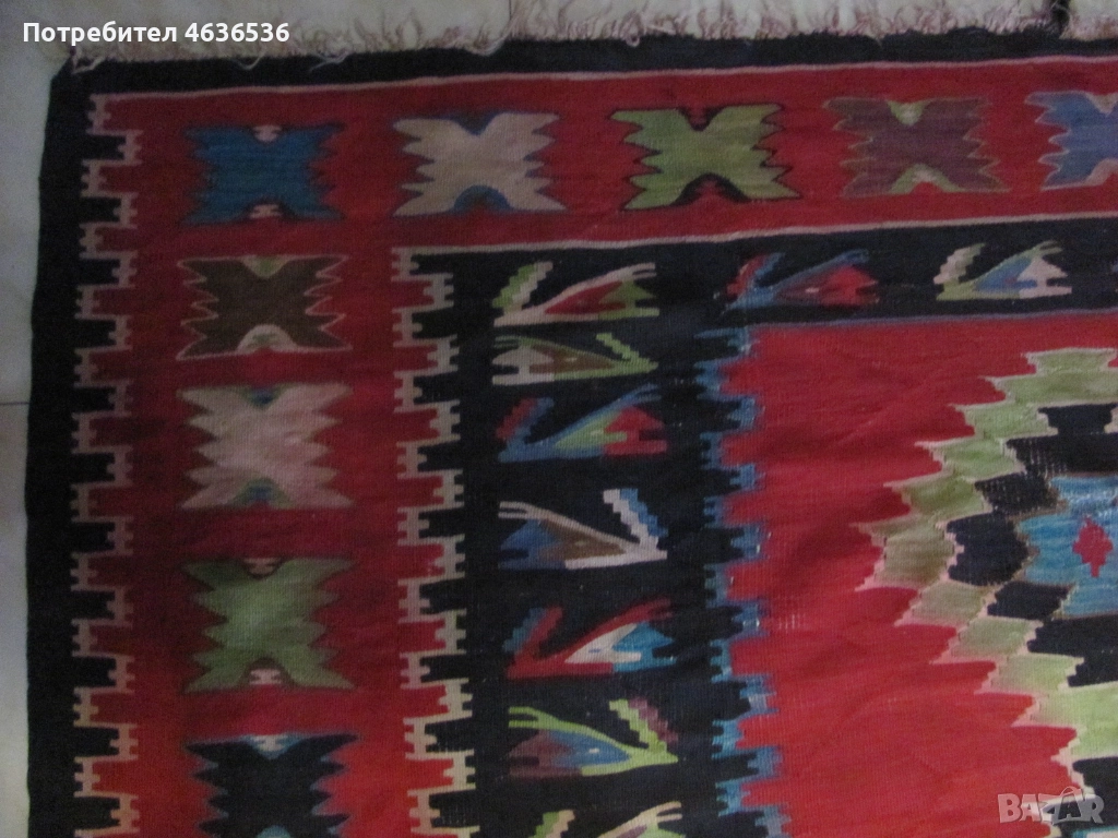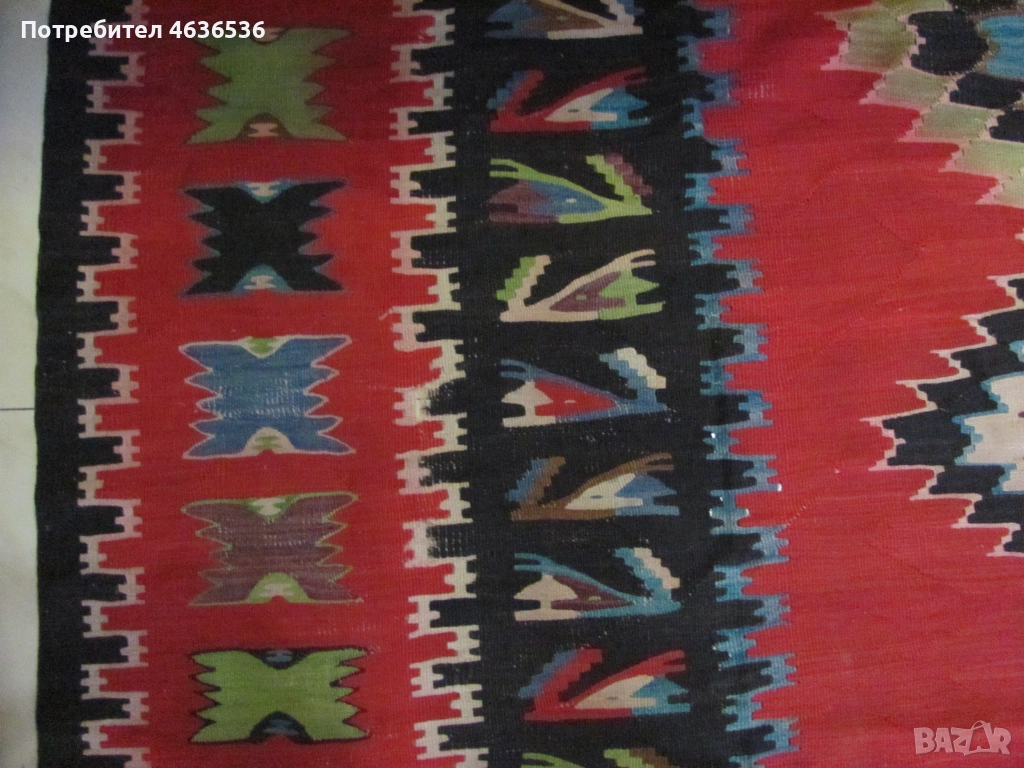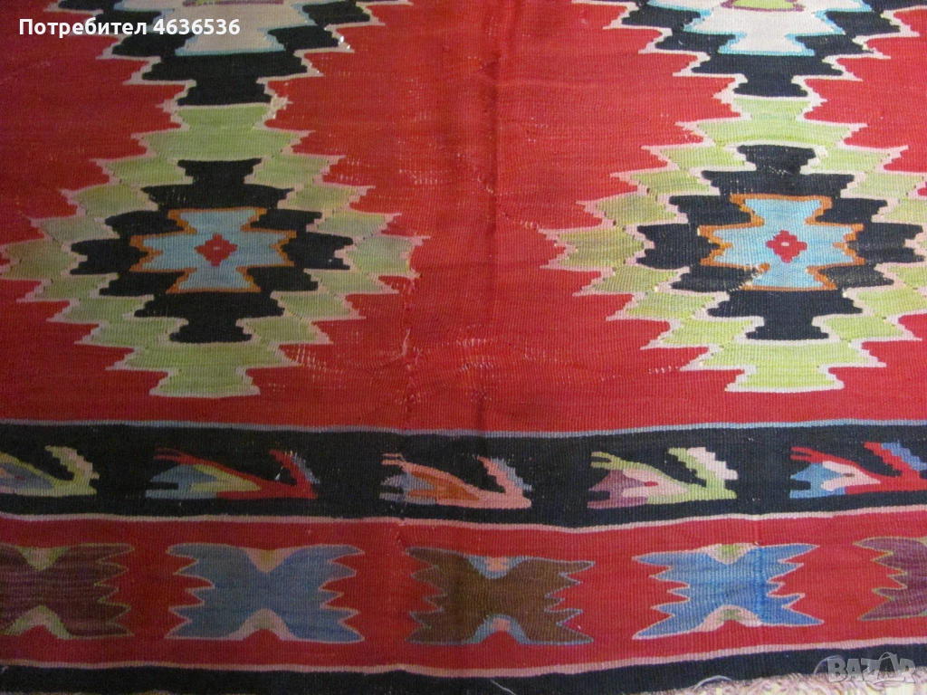 Има следи от стари реставрации. Има разтегнати нишки от дългата употреба.Няма дупки от молци.Естествени растителни бои характерни за 19век.