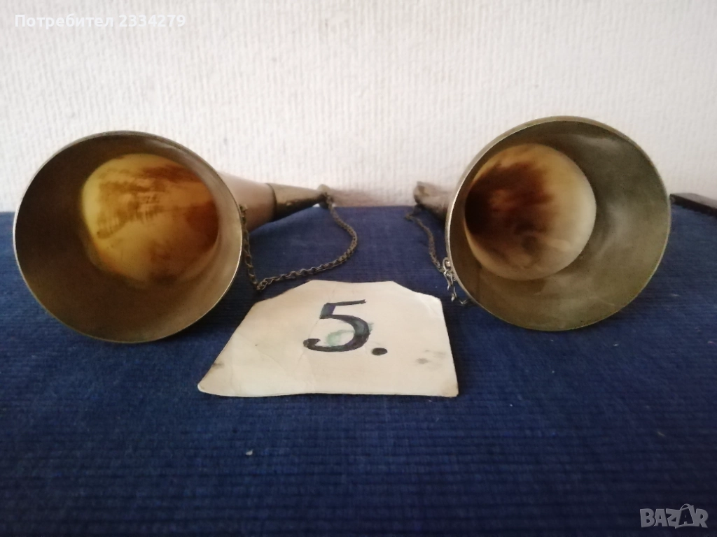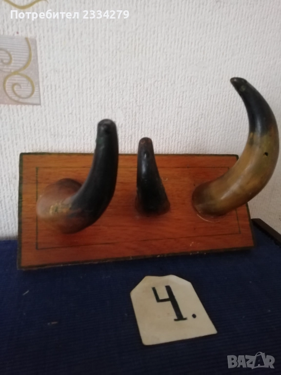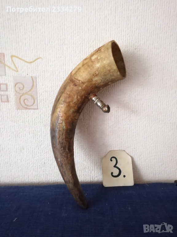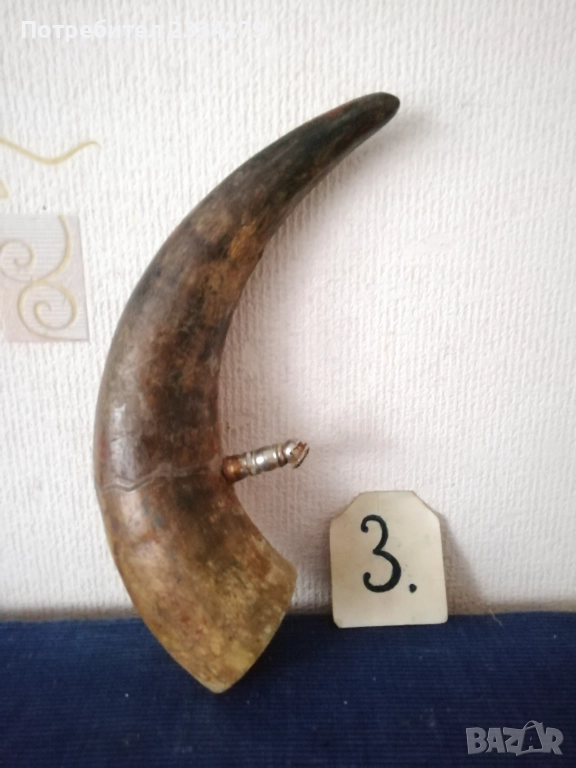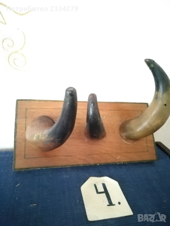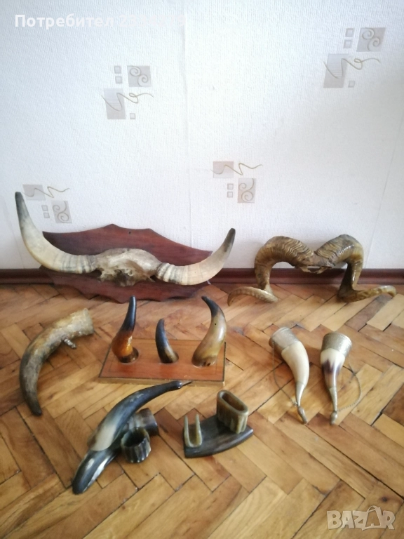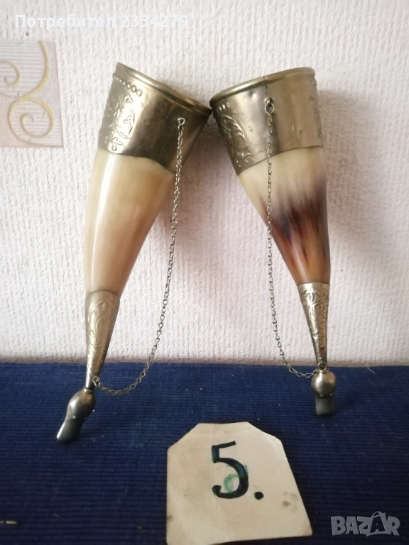 N:1 стар трофей на рога от бик, размери , цена 40€.; N:2 (ПРОДАДЕНИ) ; N:3 стара барутница от голям рог, размери , цена 15€; N'4 стара закачалка ръчно изработена от рога на бик, размери , цена 25€; N:5 стари чаши орнаментиран обков, размери , цена 17€. двете; N:6 (НЕ НАЛИЧНИ)