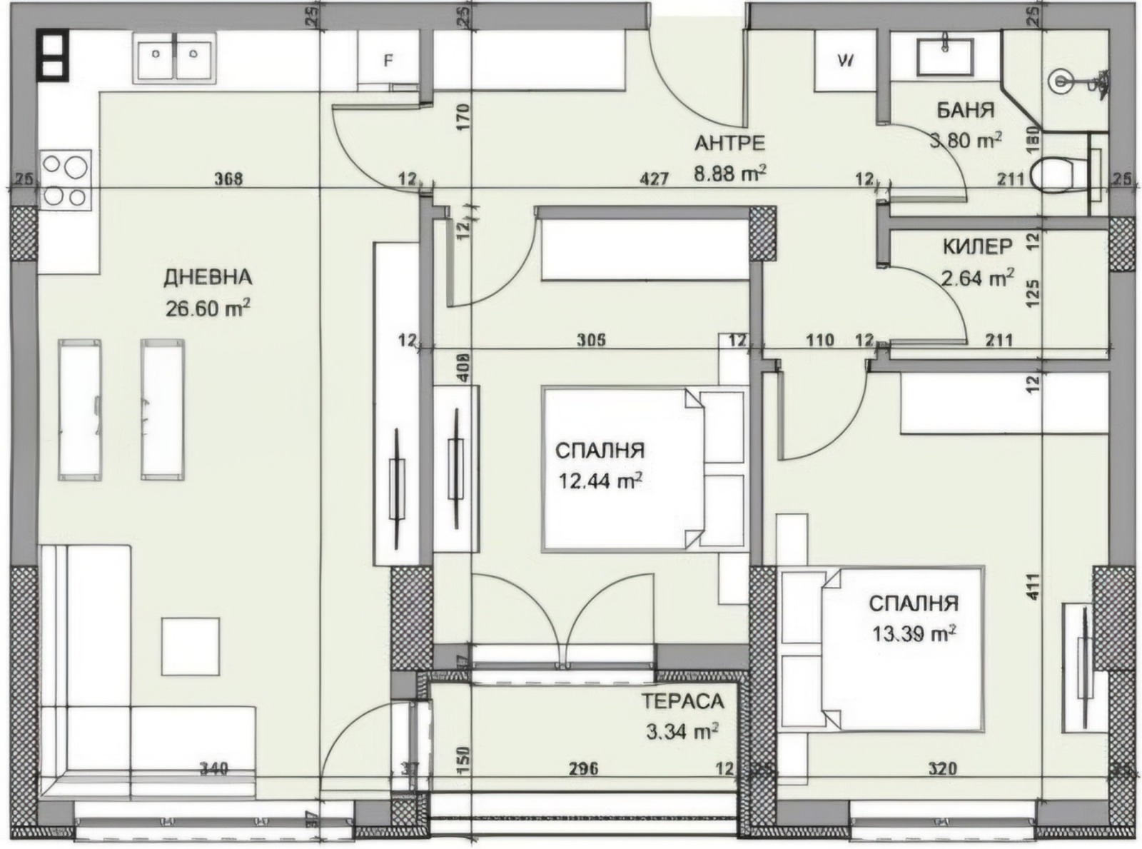 📐 Отлично Усвоен: Дневна с кухненски бокс, две спални, баня/WC, практичен килер и балкон.