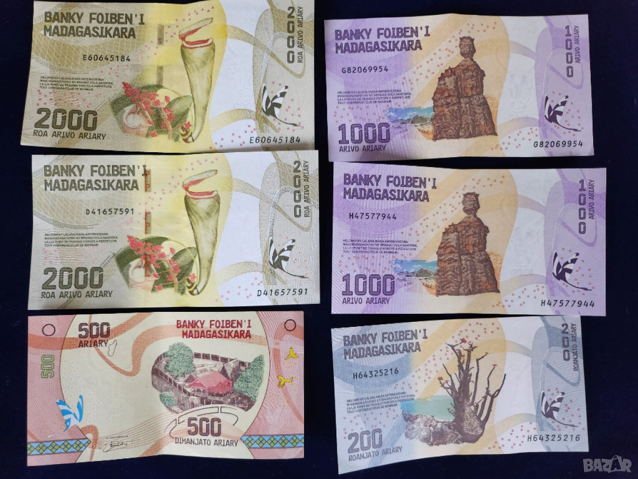 - банкноти с номинал 2000 , 1000, 500 и 200 ариари. Цена: 2,50 €/банкнота (нови, не прегъвани)