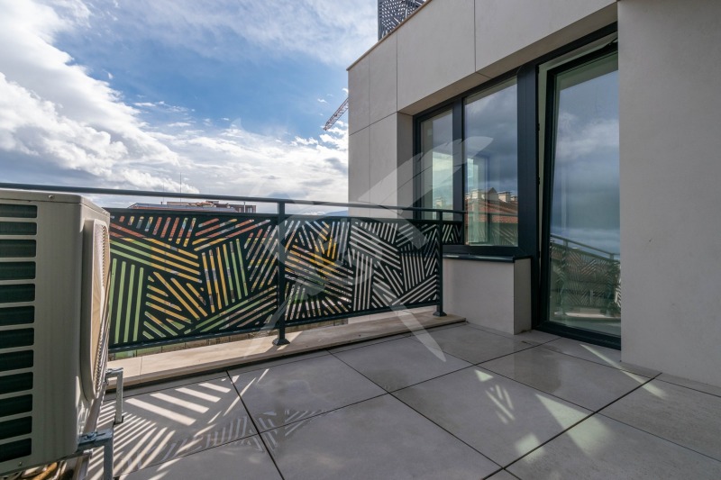 РАЗПРЕДЕЛЕНИЕ: Жилището разполага с площ от 120 кв.м. разпределена във входно антре, хол с кухненска част, две спални, две бани с тоалетни и две тераси.