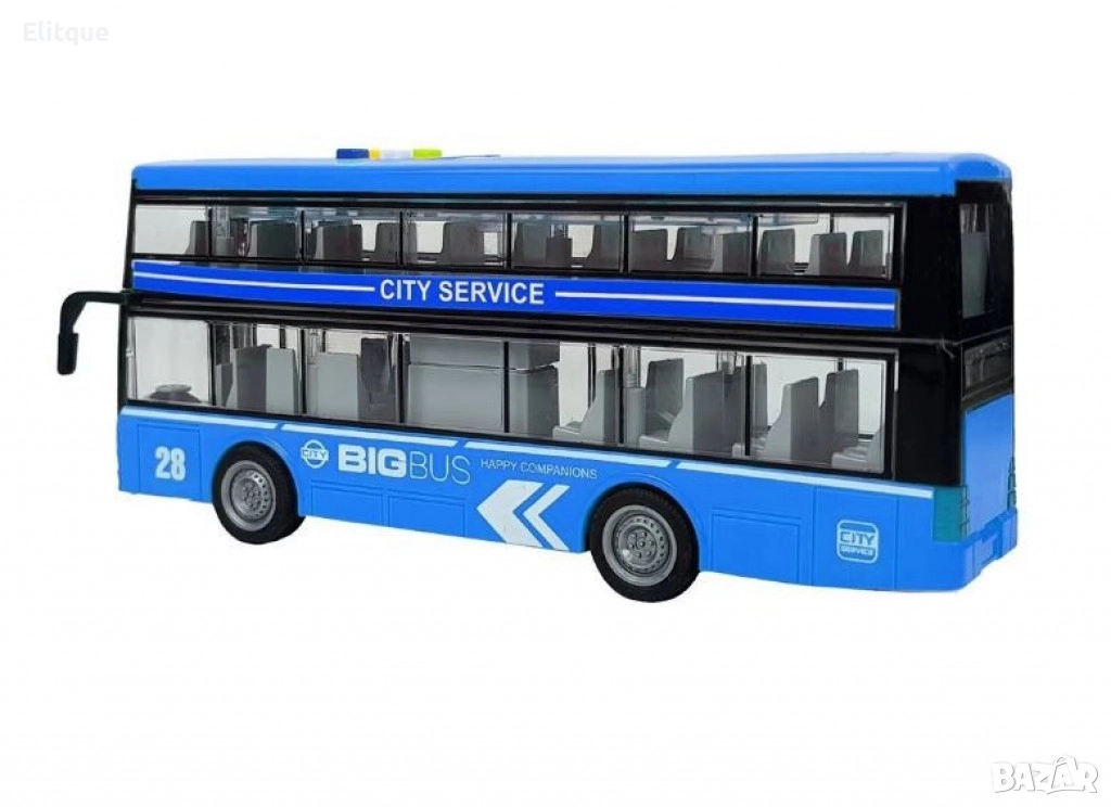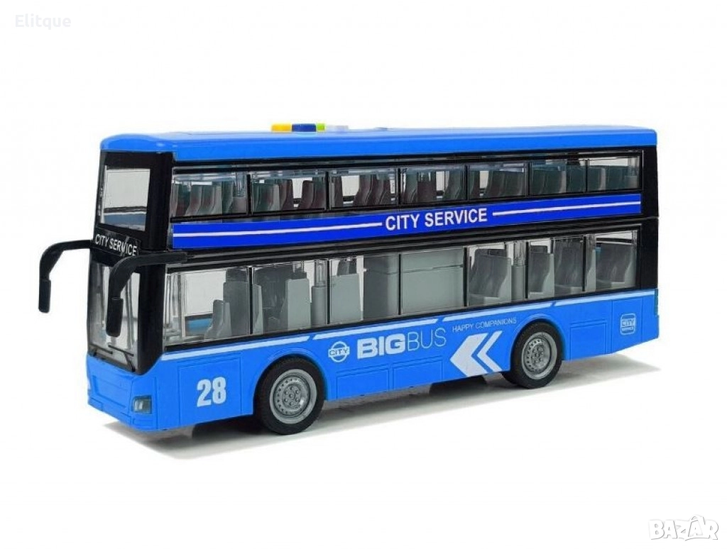 Този двуетажен автобус със звукови и светлинни ефекти е чудесен избор за подарък, който ще зарадва децата и ще ги ангажира в продължителни игри. Със своя реалистичен дизайн, фрикционен механизъм и множество интерактивни функции, автобусът ще бъде любимец в детската колекция и ще подпомага развитието на слуха, зрението и въображението на децата. Цвят: Син; Мащаб: 1:16; Захранване: Три батерии AG13; Размери на автобуса: 29 см х 8 см х 12 см; Размери на опаковката: 32 см х 12 см х 19 см; Материал: Пластмаса; Препоръчителна възраст: Над 3 години.