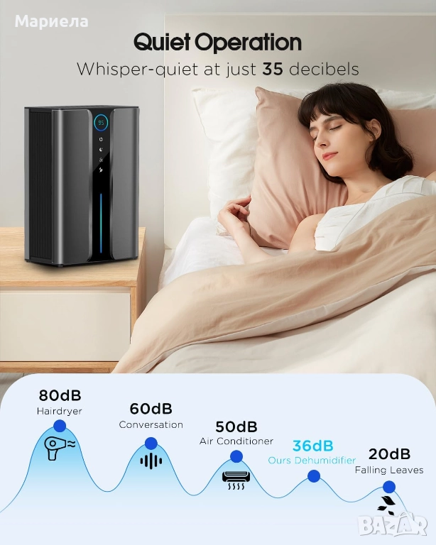 Насладете се на ултратиха работа от само 35 децибела, което прави този влагоабсорбатор подходящ за сушене на дрехи през деня или нощта, без да нарушавате съня или ежедневните си задължения, дори когато сушите дрехи.